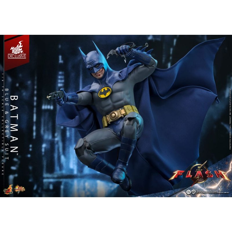 In The Flash, Bruce Wayne's secret armory comes to light - a hidden bookcase in Wayne Manor's study swings open to reveal a vault of Batsuits collected over decades from his crime-fighting past. Among them is the distinctive Blue & Grey Suit, a design that pays homage to Batman's comic book roots.Sideshow and Hot Toys proudly presents the Batman™ (Blue & Grey Suit) Sixth Scale Figure Collectible Figure, masterfully crafted to capture Michael Keaton's presence in this nostalgic yet reimagined suit. This exclusive sixth scale figure is only available in a limited quantity of 1,500 units in selected markets. The Batman figure features a newly developed blue colored cowl head with separate rolling eyeballs and three interchangeable lower face sculpts that reveal Batman's steely determination. The muscular body is clad in the newly developed Blue & Grey Batsuit, meticulously textured and detailed to reflect its cinematic design. It features a wired cape that allows for dramatic posing, and the yellow utility belt with multiple pouches adds a vintage flair that recalls Batman's classic comic silhouette.Equipped for action, Batman comes with signature gadgets, including a Grapnel Gun and a rope-attached Batarang, along with eight interchangeable hands for a range of dynamic display options. The figure is finished with a specially designed figure stand featuring two interchangeable graphic cards.The Blue & Grey Suit unites the timeless legacy of Michael Keaton's Batman with the bold visual spirit of the comics - making this collectible DC Comics collectible figure an essential addition for fans of The Flash and Batman.The Batman™ (Blue & Grey Suit) Sixth Scale Figure features:- Authentic and detailed likeness of Batman (Blue & Grey Suit) in The Flash - 1 newly developed blue colored Batman cowl head with separate rolling eyeballs and three (3) types of interchangeable lower faces showing different expressions - Muscular body with 30 points of articulation - Approximately 30cm tall - 8 pieces of interchangeable gloved hands, including: - 1 pair of fists - 1 pair of relaxed hands - 1 pair of Batarang-holding hands - 1 piece of opened gesture left hand - 1 piece of Grapnel Gun-holding right hand - Available in a limited quantity of 1,500 units in selected marketsCostume:- 1 newly developed Blue & Grey Batsuit - 1 piece of blue colored cape (bendable wire embedded) - 1 pair of blue colored gauntlets - 1 yellow colored utility belt with a gold colored buckle and multiple pouches - 1 pair of blue colored long bootsWeapons:- 1 Grapnel Gun - 1 rope-attached Batarang