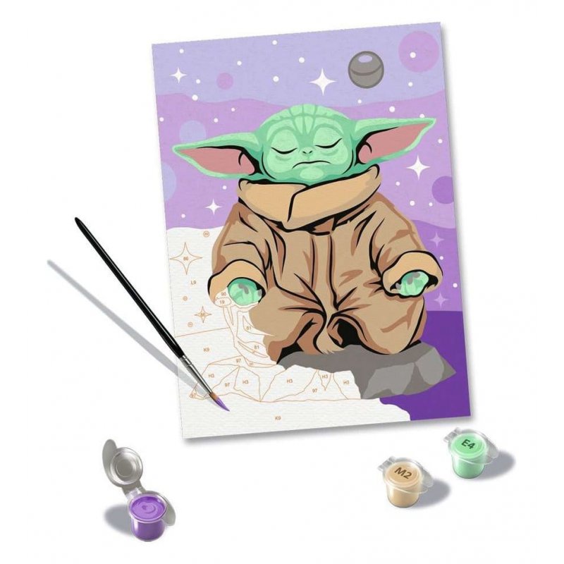 Cool designs, bright colors and glossy varnish for a perfect finish. The trendy Meditating Grogu motif offers great painting fun for adults aged 12 and over. The motif lines are already pre-printed and numbered and must be painted with the ready-mixed acrylic paints. This is painting fun with a guarantee of success for a unique wall decoration. Painting has never been so easy! Contents: 1 painting board, 15 water-based acrylic paints in resealable pots, 1 quality brush, color palette and instructions