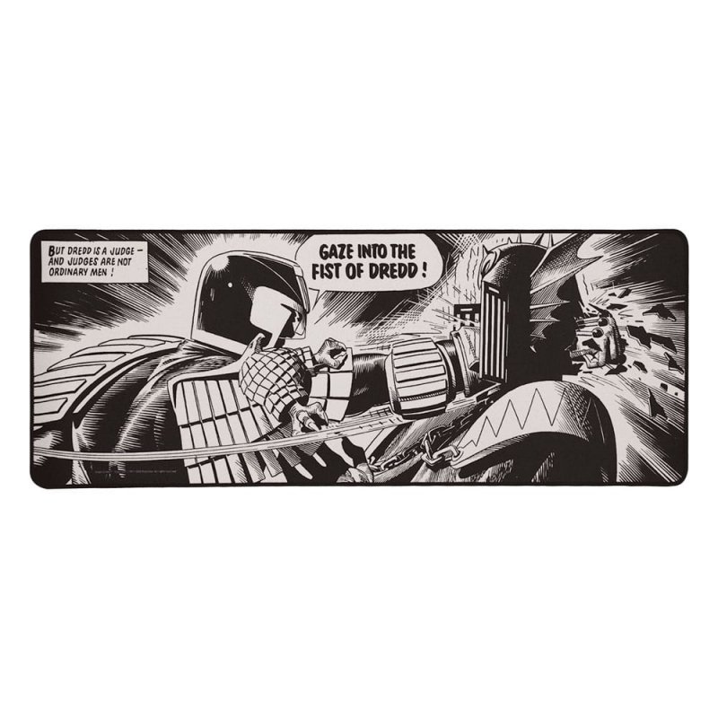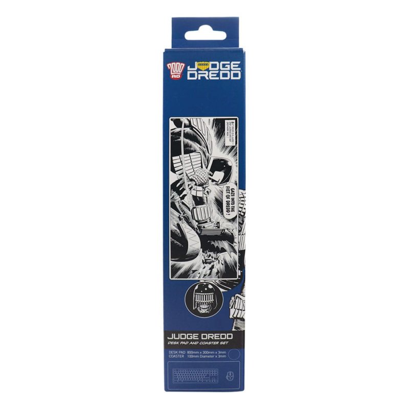 """Dredd is a Judge - and Judges are not ordinary men! "" Never a truer word said, as Dredd punched Judge Fear so powerfully his fist broke through the back of Fear's helmet! This panel, taken from 2000 AD Prog 227 published in 1981, is one of the most iconic images in comics history, part of the influential Dark Judges storyline. Topped with micro-textured fabric with reinforced edges and non-slip rubber base, this Judge Dredd desk pad measures 800x300x3mm and the non-slip coaster (which is made of the same material and depicts Judge Death) measures 100mm in diameter. - Officially licensed - Reinforced edges - Non-slip base - Desk pad - 800x300x3mm - Coaster - 100mm diameter"