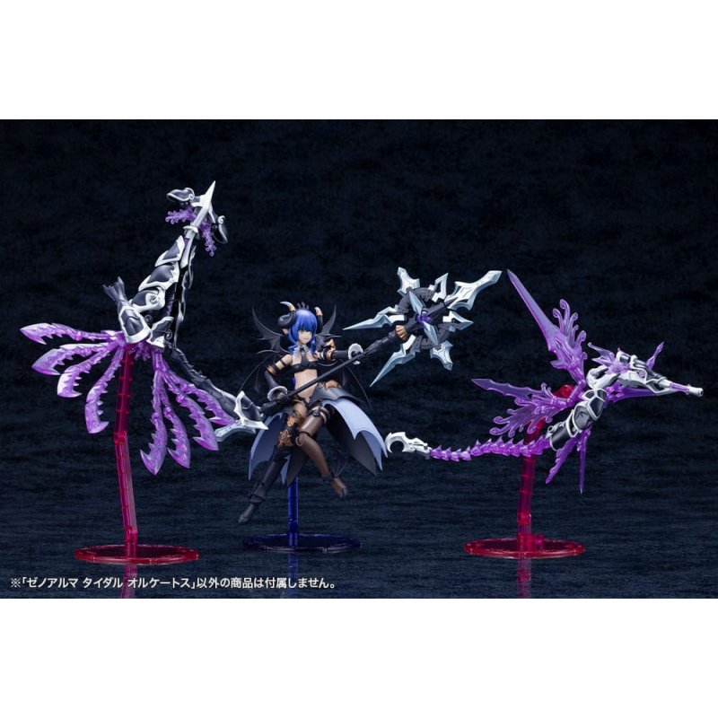 Introducing Tidal Orketos from the XenoAlma Series - A weapon line that expands the lore and customizability of the ARCANADEA series.By rearranging parts, users can build the self-contained Monster form, three different Weaponry forms that serve as armaments for Dears, or recreate Hydro Zeeforce and Trickle Dekapodia.Tidal Orketos has been specially designed to be used in combination with Velretta, and can be attached to various parts of her model. Each part is connected via 3mm joints, allowing them to be used not only with Arcanadea characters but with all original Kotobukiya series. Includes a set of bonus colorless clear parts.Included Items & Features: - In addition to Tidal Orketos, parts can be replaced to create Hydro Zeeforce and Trickle Dekapodia. - Three Weapon Modes can be created, each serving as armaments for Velretta and other Dears. - Articulation in various parts ensures excellent mobility in Monster Mode, allowing for dynamic posing. - The 3mm connectors on each part allow for standalone customization and compatibility with existing series such as M.S.G, Frame Arms, Frame Arms Girl, Hexa Gear, Sousai Shojo Teien, and Megalomaria. - Includes the standard Arcanadea base, allowing Tidal Orketos to be displayed in flight. - Includes a set of bonus colorless clear parts.Weapon Mode - Crown: 3mm connection allows for connection with other Kotobukiya kits. - Head Fin: Can be equipped by some Dears, including Velretta, Soffiera, and Elena. - Shoulder and Thigh Armor: 3mm joint connection allows connection with other Kotobukiya kits. - Wing Unit: The base is connected by a 3mm joint, allowing for flexible movement. - Swords: Two sets of two unique swords. The grips can also be extended to allow characters to hold them. The swords can be displayed floating in the air using the base and attachment. - Tail: The base is articulated and feature ball joints that allow for flexible movement. The 3mm-diameter ball joints can be shortened and endlessly added to. The tail can be held as a whip. - Tentacles: Features a 3mm joint in the base and ball joints that allow for flexible movement. The tentacles can be reconfigured into a Back Unit. - Leg Armor: The ankle and knee armors can move with the model, allowing for flexible posing. - Tidal Harpoon: The grip is articulated and be posed in various ways. The harpoon can be separated into a lance and gun.*Note that some models are not applicable due to their different structures.