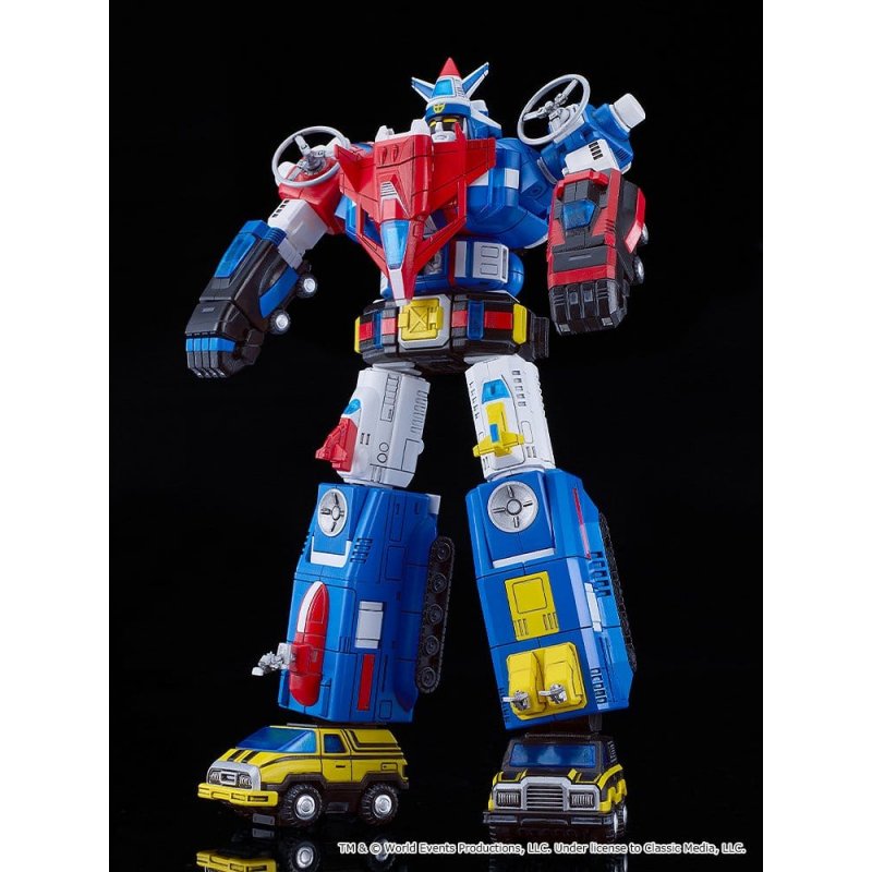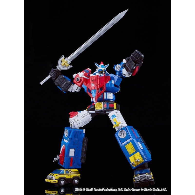 From "Armored Fleet Dairugger XV" comes a MODEROID plastic model of Dairugger XV!- The model stands at about 200mm in height and features various points of articulation. - An astonishing 15 units combined into one! All Rugger machines can be combined to form Darugger XV without the use of additional parts. - Rugger Sword, Dairugger Lancer (long/short), Spin Cutter, and interchangeable hand parts are included. - Translucent parts have been used to create the Dairugger Lancer to emulate the lighting effects of the anime. - Dairugger Kilders are removable. - Can be held in the hand like a spin cutter. - The Rugger Machines can be combined into air, land, and sea teams. Each team's Rugger Machines can be combined to recreate the Kurugger, Rickrugger, and Kairugger. - The parts of the mecha have been separated into various colored runners and pre-painted parts, and the model kit also comes with stickers, making it easy to recreate the mecha from the series with a simple assembly.
