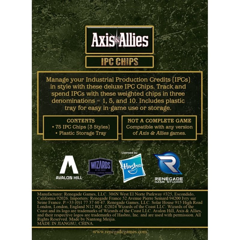 Manage your Industrial Production Credits (IPCs) in style with these deluxe IPC Chips. Track and spend IPCs with these weighted chips in three denominations - 1, 5, and 10. Includes plastic tray for easy in-game use or storage.Not a complete game. Compatible any version of Axis & Allies.Features - Track and spend IPCs - Includes plastic tray for easy in-game use or storage - 75 weighted IPC chips in three denominations - 1, 5, and 10.Contents - 75 IPC Chips (3 Styles) - Plastic Storage TrayAt a Glance - For Ages: 12+