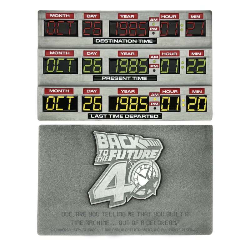 """First, you turn the time circuits on.""The equipment used to tell the DeLorean where (or rather, when) you want to go to, the time circuits were integral to the time machine and one of Doc's ingenious inventions. This limited edition ingot depicting the time circuit's display measures 90 x 56.5mm and is limited to 1,985, celebrating 40 years since the release of Back to the Future. It's individually numbered to the reverse and comes with a display stand, as well as an art card.- Limited to 1,985 - Officially licensed - Individually numbered to reverse - Size 90 x 56.5mm - Art card included "