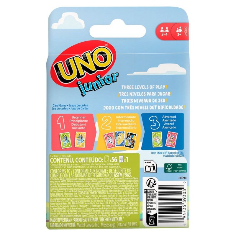 Little ones will love UNO Junior with Bluey! This child-friendly card game with colourful elements and characters from the series can be played at three levels of difficulty, growing with the children as they play. Players lay down cards that match the colour, number or character, boosting their confidence. A fun introduction to the tradition of family game night for 2 to 4 players aged 3 and up.