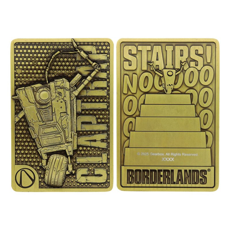"Appearing in many different Borderlands games, Claptrap is the fan-favourite general purpose robot produced by manufacturer Hyperion. This limited edition ingot depicts the CL4P-TP robot to the front, and one of his mortal enemies, stairs, to the reverse, along with its induvial number as one of 5,000 worldwide.- Officially licensed - Limited to 5,000 - Antique brass plating - Individually numbered to reverse - Size 90 x 60mm"