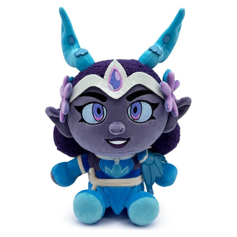 Sitting at 22 cm tall with colorful flowers resting to either side of the jewelled circlet wrapping around her head, thick purple hair is pulled into two buns at the back as a pair of bright blue horns reach out from the top. With dazzling purple eyes beaming from her face above a confident smile, her bodice has a heart-shaped chest piece at the center as a pale belt wraps around her waist, and a winged pauldron covers her left shoulder. This plush is packed to the seams with 100% PP cotton and is made of minky and sherpa materials with accents of felt, absolutely perfect for cuddling or battling with!