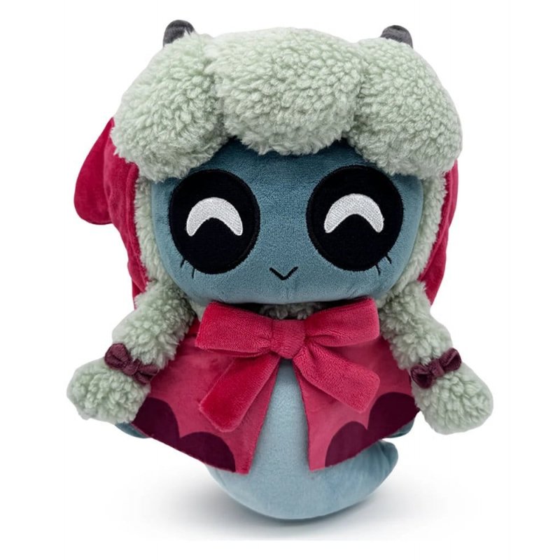 Floating at 22 cm tall with bright white pupils shining out from dark eyes and a (mostly) innocent smile as ghostly blue wool surrounds her dark face, a pair of small horns poke out from the top of her head in front of a red cloak that covers her torso and is tied with a bow at the neck between a pair of long braids as her wispy end curls to the side. This plush is packed to the seams with 100% PP cotton and is made of normal and sherpa minky materials, absolutely perfect for cuddling or haunting with!