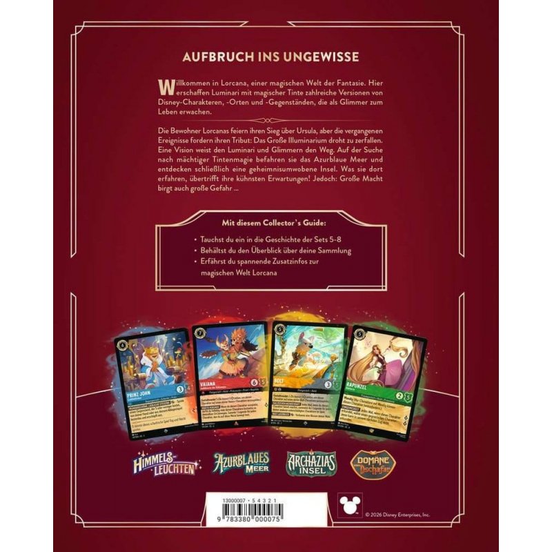 A journey into the unknown: with the Luminari on a trip through Lorcana. The Luminari celebrate their victory over Ursula, but past events take their toll: The Great Illuminary threatens to crumble. In search of help, the Luminari discover powerful ink magic. But great power also holds great danger... This second Collector's Guide tells the story of the game and includes an overview of all cards from sets 5 to 8 - the perfect companion to the Disney Lorcana Trading Card Game for collectors, players, and Disney fans! Disney Lorcana is a popular trading card game where players experience exciting adventures with their favorite Disney characters. But it's more than just a game: in the magical world of Lorcana, stories await at every corner. Here, Luminari use magical ink to summon countless Glimmers of beloved Disney characters, places, and items, and embark on adventures to protect and preserve the stories in Lorcana. The official Collector's Guides to the Lorcana TCG combine these stories with exciting Easter eggs and an overview of all cards from a year. The second volume contains the stories and a card catalog of these sets: "Shimmering Skies", "Azurite Sea", "Archazia's Island", "Reign of Jafar" and "Illumineer's Quest: Palace Heist". More info at disneylorcana.com