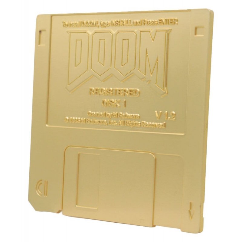 "What's more retro than obsolete technology? Celebrating the humble 3½-inch, 1.2mb floppy disk that the game was originally released on back in 1993, this limited edition imitation gold plated DOOM Floppy Disk Replica comes in a box displaying the original game artwork, has a display stand included, and is individually numbered as one of 5,000 worldwide.- Officially licensed - Limited to 5,000 - Individually numbered on reverse - Size 89 x 89mm - Imitation gold plating - Display stand included"