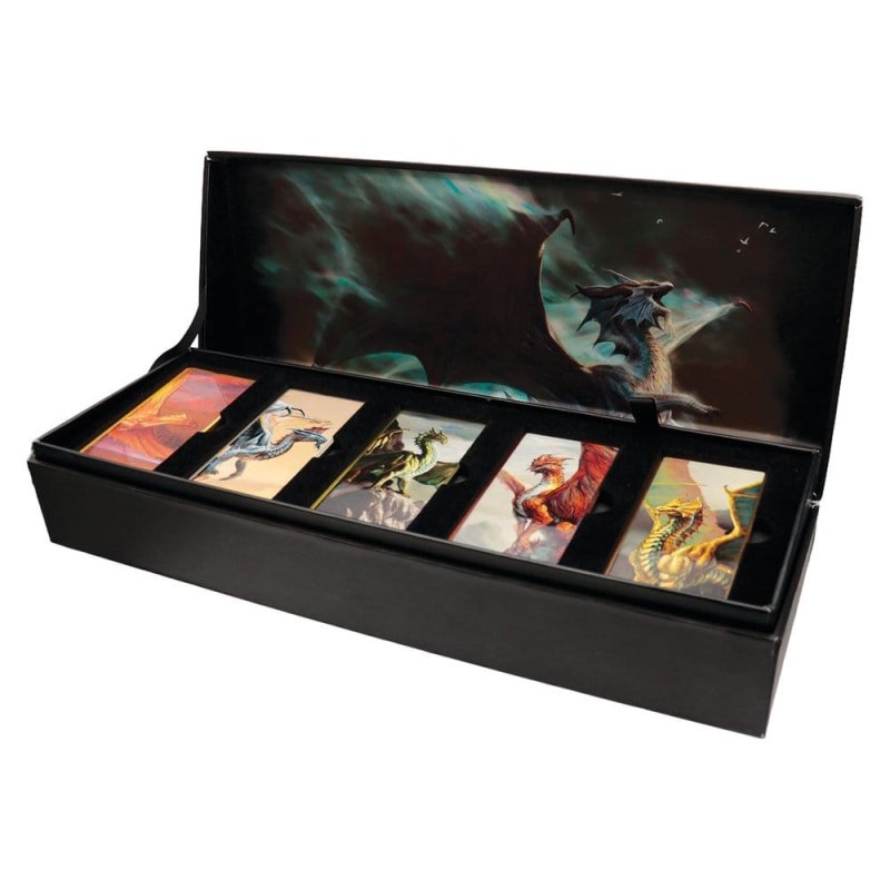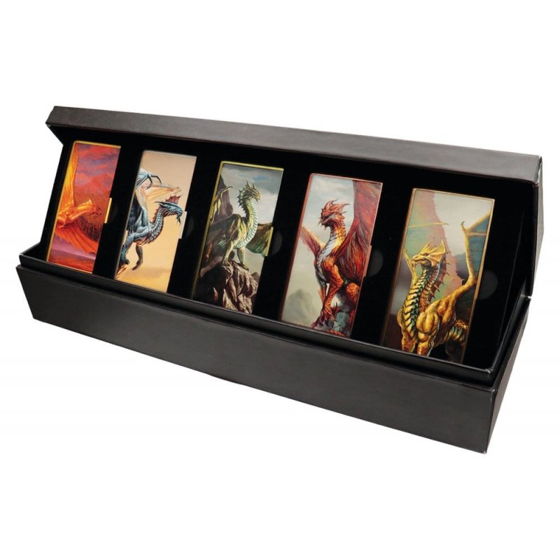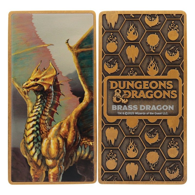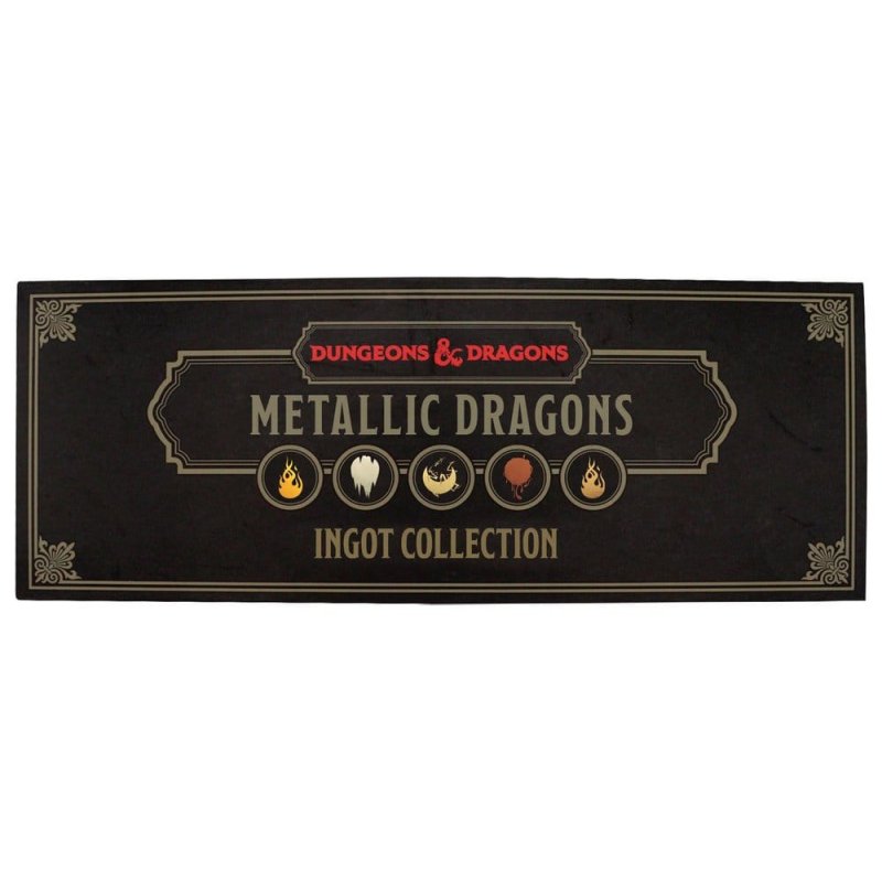 "Celebrate the legendary D&D Metallic Dragons with this officially licensed 5-Piece Ingot Collectors Set. Distinguished by the colours of their scales and revered for their wisdom and power, these iconic dragons are brought to life in a unique metal collection.This limited edition set includes Gold, Silver, Bronze, Copper, and Brass dragons, each represented by its own intricately detailed metal ingot. Every piece features a double-sided design with richly detailed artwork inspired by classic D&D lore, giving the set a striking display.With an edition size of 1,974 worldwide, honouring the year Dungeons & Dragons first launched, this collection makes for a special distinctive piece for fans, fantasy art enthusiasts, and collectors of individual D&D memorabilia.- Officially licensed - Limited to 1,974 - Individually numbered to box - Gold Dragon - 24k gold plating - Bronze Dragon - antique brass plating - Copper Dragon - antique copper plating - Brass Dragon - antique gold plating - Silver Dragon - misty silver plating - Each size 90 x 45.9mm - In display box"