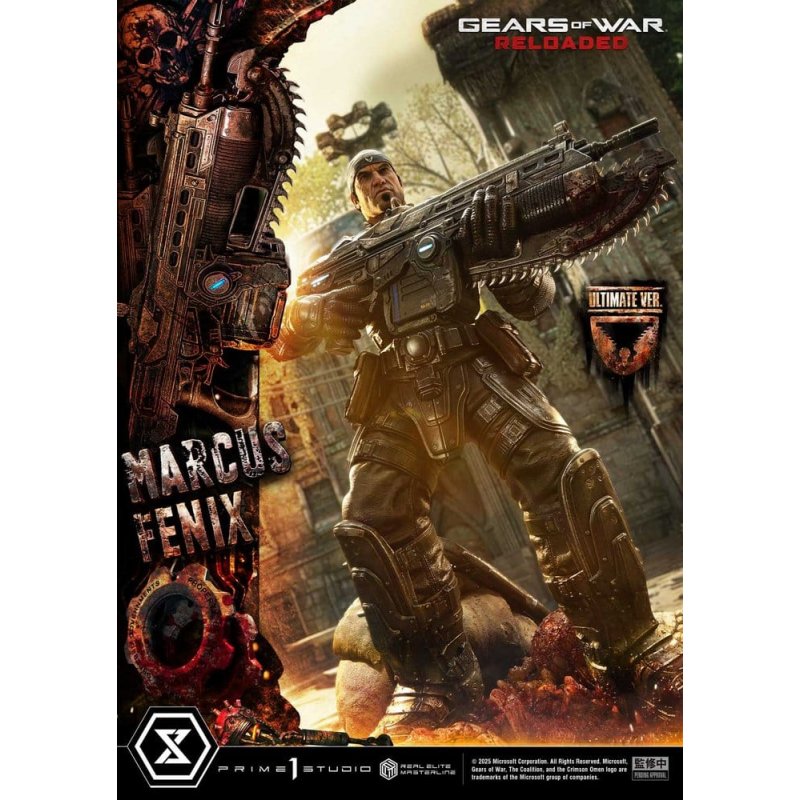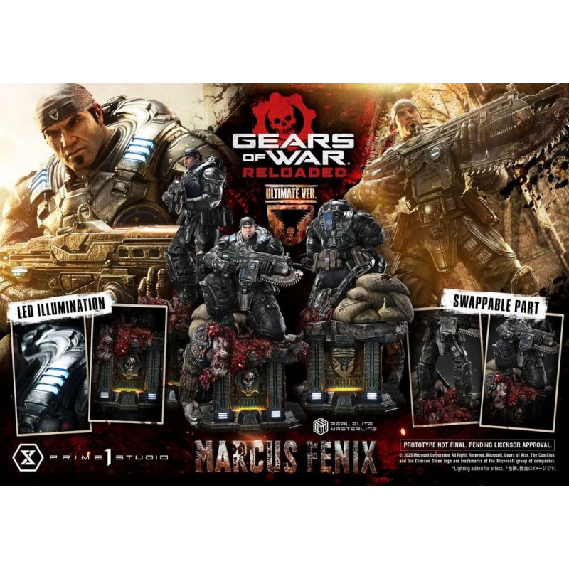""Looks to me like you need all the help you can get." Amid a battlefield stained in blood, a legendary Gear arrives in 1/3 scale.Released with the series' 20th anniversary in mind, ""Gears of War: Reloaded"" brings a remastered third-person shooter masterpiece back to the front lines. From this title, Marcus Fenix is recreated as a Real Elite Masterline statue.With graphics forged by the latest technology captured in crisp detail at 1/3 scale, this statue portrays Marcus in striking realism. His one-knee stance, Lancer at the ready, is a sight you've seen countless times in-game. It expresses the thrill of cover-based shooting-firing while taking shelter behind obstacles-through a pose.From his blue-gray eyes and the scar on his right cheek to the rugged set of his features, Marcus' tough portrait feels strikingly lifelike. The COG armor is sculpted with textures differentiated by material, then finished with weathering suited to harsh conditions. Even the Lancer's heavy presence is rendered convincingly, down to the realistic tone of blood caked onto the chainsaw.The special base evokes the brutality of the battlefield, and the fallen Drone is crafted with meticulous attention-even to the severed surfaces. Emblems, the Gnasher, and a necklace draw you deeper into the world of the game.The COG armor, Lancer, and special base are also equipped with LED lighting. Cold, inorganic blue. A blazing orange. The drama of light feels straight out of the game.A standing lower body is included as well, making his powerful physique appear even larger. Two feet planted firmly on the ground, the display rises to nearly 1 meter in height. Take in its overwhelming presence.A legendary Gear, built in 1/3 scale with uncompromising realism-this is the powerful reinforcement that will rank up your ""Gears of War"" collection." Specifications:- Gears of War: Reloaded-Themed Base - 2 x Swappable Lower Bodies (Crouching, Standing) - LED Illumination (COG Armor, Lancer, Base)LED Power Supply Method: TBD * Please prepare batteries, USB cables, or other necessary items depending on the final power supply method.