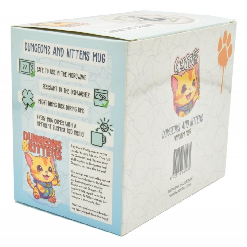 When we play DnD, we always get accompanied by our friend's cat who got its own Dungeons & Cats design, but let's not forget our newest member and smallest little critter among our familiars. The kitten. This little fur ball wants to join in on the fun and we shall deliver. With no claws yet to even speak of, we gifted him with a sword. What could go wrong?This DnD mug is perfect for coffee, tea and hot chocolate during those intense DnD sessions!! The mug is printed with High quality sublimation printing, which makes it an appreciated gift to every true hot beverage lover. The design is printed on both sides of the mug, so you and your party members can enjoy it!The mug is especially crafted with the idea to be gifted to you, your party members, friends and family. Along with a little gift of a D20 in every mug, you will be able with every enjoying moment of your drink to; Roll for initiative.Presented in a decorative Window Box, the Mug is made of Ceramic that makes it Dishwasher as well as Microwave safe.