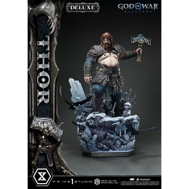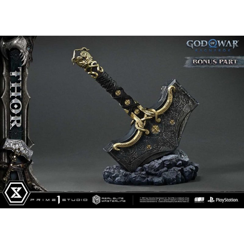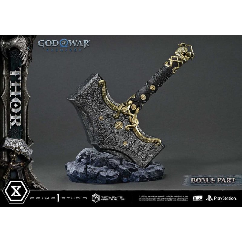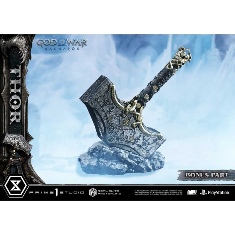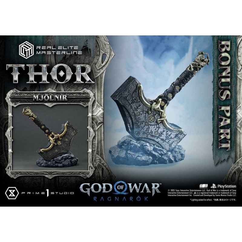 In "God of War Ragnarök", Kratos journeys across the Nine Realms to face the looming threat of Ragnarök. Following his release in the Real Elite Masterline series, "Thor" now joins the lineup.This 1/3 scale statue brings to life the essence of Thor-a destroyer burdened by sorrow-through strikingly realistic sculpture. His piercing eyes, the scar trailing under one, and tattoos brimming with mystic power evoke his mythical presence. His bearded face, partially shadowed by disheveled hair, is meticulously crafted to capture a brooding expression. From the bulging torso atop layers of thick muscle to the powerful limbs shaped like tree trunks, every inch is carved with deep-set wrinkles and rugged skin textures that speak of a long and weary path. The leather armor and belts are adorned with traditional patterns, while the weathered metal embellishments have been painstakingly recreated. Even Mjölnir, the symbol of his wrath, combines a brutal silhouette with delicate detailing-a piece of both destruction and mystique.Product Specifications: - God of War: Ragnarok Themed Base - Two (2) Swappable Heads (Serious, Angry) - Three (3) Swappable Left Arms (Mjölnir Down, Raised, Recall) - Fabric cloak (removable) - Head Stand - LED Light-Up Features (angry eyes, Mjölnir, summoning effect) - Display model of Mjolnir Limited to 350 pieces.