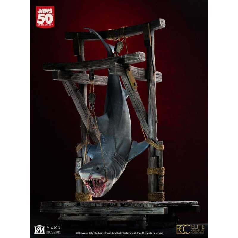 Considered a timeless classic, Jaws is the 1975 American thriller directed by Steven Spielberg. Based on the 1974 novel by Peter Benchley, Jaws became widely considered as one of the greatest achievements in film.Universal Studio's Jaws ride first debuted in 1990 in Orlando Florida. With a $45 million dollar installation budget, the ride quickly became a well-known attraction at the park and another installation was later opened at Universal Studios Japan in 2001.The hanging Shark in Orlando, a photo-opt second to none, became a tribute to the great movie's history.Elite Creature Collectibles has crafted our museum-quality Hanging Shark maquette featuring state-of-the-art, detailed sculpting and paint applications. The sculpture was modeled by Bitan, Mavis, and painted by Oskar Ankarudd.Celebrate 50 years of Jaws with ECC!Specifications: - Approximately 30 inches in height. - Approximately 21.6 inches in width. - Approximately 16.5 inches in depth. - Cast in high-quality resin with hand-painted details. - Museum-style glass eyes, and detailed hand paint. - Attractive themed display base with the "WANTED" poster. - Certificate of Authenticity signed by Mavis and Oskar Ankarudd. - Made to Order.Limited in production to 200 pieces worldwide!