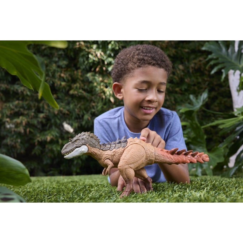 This Jurassic World Gigantic Thrashers Gorgosaurus action figure can perform two spectacular attack moves and also features an evolution function. A button on the side activates a dramatic twisting motion with the tail, and the tail spikes undergo an evolution. A second button activates a sideways bite attack and the mutation continues as the armour plates on its back extend. Measuring approximately 38 cm long and featuring authentic design, decoration and texture, this large species toy is ready for battle or wild poses. By scanning the tracking code on the Gorgosaurus' foot in the free Jurassic World Play app with a compatible smart device (Android or iOS, not included), a digital version of the dinosaur is unlocked, as well as a fun game in which various vehicles race on land, in the air and in the water. This toy is suitable for dinosaur fans aged 4 and up. Colours and designs may vary.