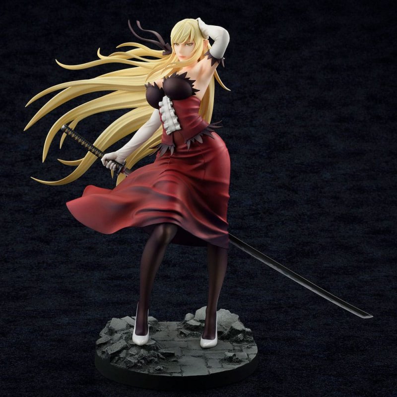 The King of Strange and the StrongestIntroducing the "Kiss-shot Acerola-orion Heart-under-blade ", which has the nickname "King of the Strange" that appears in the popular theater animation "KIZUMONOGATARI".A rare species of vampire that can kill a Strange.Blondes, white skin, and worried eyes.The female vampire "Kiss-shot" with a bewitching appearance in a damaged dress has been reproduced.It stands approx. 13 cm tall and comes in a window box packaging.