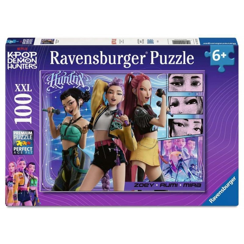 High-quality children's puzzle by Ravensburger under the KPop Demon Hunters license. The 'Happy fans, happy Honmoon!' puzzle consists of 100 XXL pieces and is suitable for children from 6 years. Finished puzzle size: 49 x 36 cm.