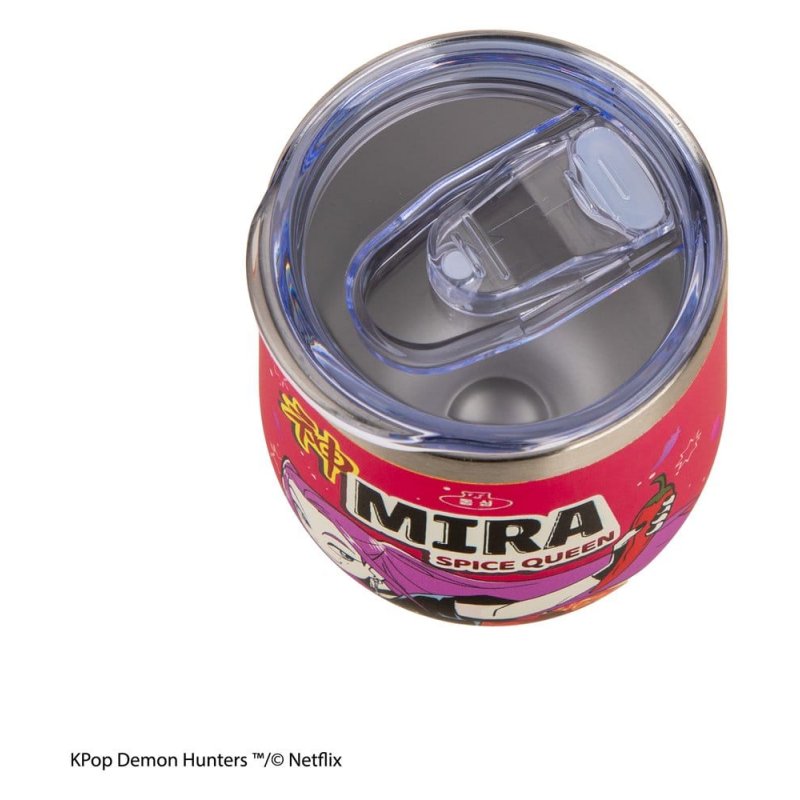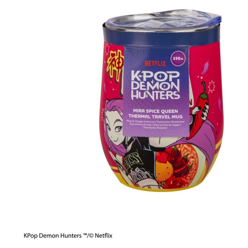 This KPop Demon Hunters Travel Mug Mira Spice Queen is an officially licensed product from Cinereplicas. The body is made of stainless steel and the lid is plastic. Size: 350 ml (11.8 oz)