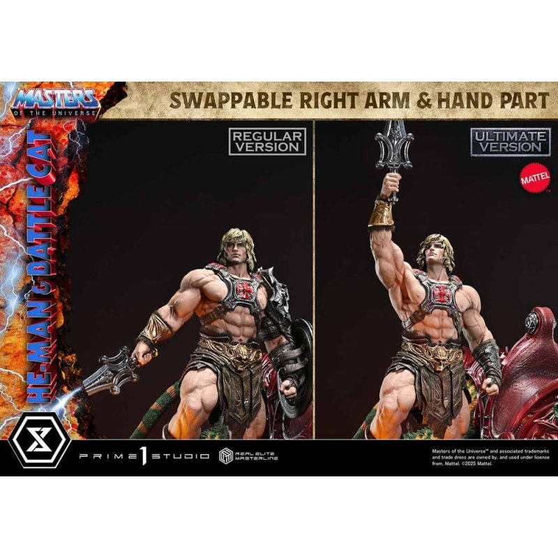 "By the Power of Grayskull! I HAVE THE POWER!" The Most Powerful Man in the Universe and his ally-realistic 1/4 scale.Set on the planet Eternia, "Masters of the Universe" tells an endless tale of battles between good and evil. From this grand saga that has continued since 1982, He-Man & Battle Cat now join the Real Elite Masterline.Over its long history, He-Man's physique and gear have taken many different forms. For this statue, we have chosen the traditional look that everyone imagines when they think of the hero. On top of that iconic style, we have layered in essences from each era, capturing a "tradition in evolution" in 1/4 scale, alongside his ally, Battle Cat.His wild hair and striking portrait, along with the finely honed body that embodies "the Most Powerful Man in the Universe," blend realistic detail with subtle stylization. The massive Power Sword, his battle harness, and the shoulder armor and loincloth accented with fur are all crafted with rich, tactile surfaces.Battle Cat's luxuriant fur is shaded with carefully calculated light and shadow, bringing a sense of life to his imposing frame. Intricately engraved armor, eyes and fangs filled with fighting spirit-all come together to suggest a story within his powerful presence.The heavy, specially designed base is inspired by Castle Grayskull. Inside, an LED unit lights up the eyes of the front gate and the seething magma below, evoking the hidden, overwhelming power that lies within.He-Man's upper body with the Power Sword raised high toward the heavens. Battle Cat's closed mouth, creating a powerful, eloquent silence. Enjoy combining these display-changing parts with the bust stand to suit your display.He-Man and Battle Cat, brought to life with realistic color and form-add the Most Powerful Appeal in the Universe to your collection.- Masters of the Universe-Themed Base with LED IlluminationLED Power Supply Method: TBD * Please prepare batteries, USB cables, or other necessary items depending on the final power supply method.