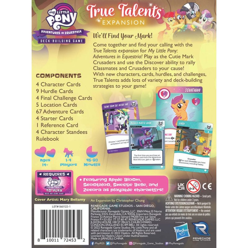 We'll Find Your Mark!Come together and find your calling with the True Talents expansion for My Little Pony: Adventures in Equestria! Play as the Cutie Mark Crusaders and use the Discover ability to rally Classmates and Crusaders to your cause! With new characters, cards, hurdles, and challenges, True Talents adds lots of variety and deck-building strategies to your game!This expansion requires the My Little Pony: Adventures in Equestria Deck-Building Game.Features:- New Discover mechanic encourages themed deck-building! - Play as Apple Bloom, Scootaloo, Sweetie Belle, and Zecora! - New player cards, hurdles, and challenges to enhance your game!Contents Summary:- 21 Oversized Cards - Characters, Challenges, Hurdles - 76 Standard Cards - Starters, Situations, Locations - 4 StandeesAt a Glance- Number of Players: 1-4 - For Ages: 14+ - Playing Time: 45-90 min