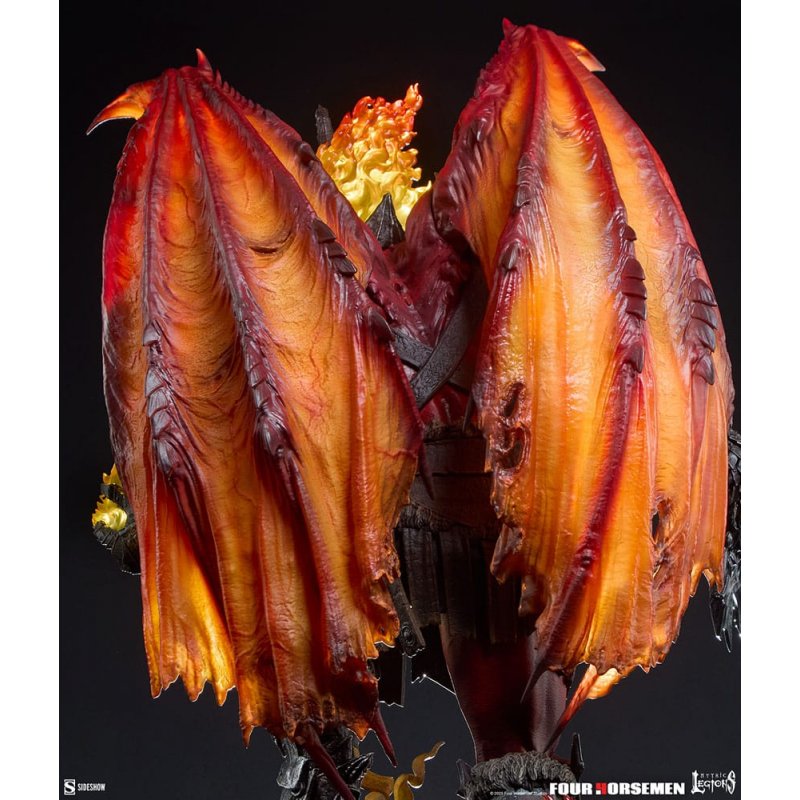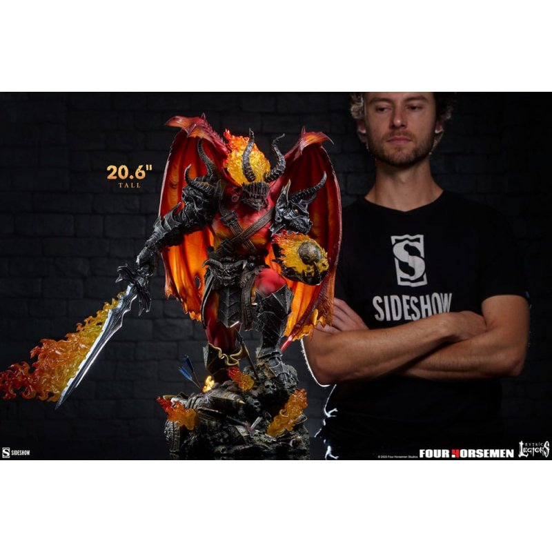 Sideshow presents the Arethyr: War Statue, a fully sculpted collectible inspired by the hellish action figure from Mythic Legions by Four Horsemen Studios.The embodiment of war itself, Arethyr leads a legion of brutal warriors. His mystical weapon the Aetherblade burns brightly at his side as he seeks to reunite his malevolent siblings and lay waste to Mythoss with fire and fury.The Arethyr: War Statue measures 20.6" tall x 23.44" wide x 13.3" deep, capturing this hellion's hunger for battle. The warmonger brandishes the flaming Aetherblade sword as he storms over a field of broken armaments and fallen fighters. His devilish form exudes brute strength, with leathery wings poised to unfurl. Arethyr is protected by wicked black armor forged in the ruthless fires of conflict, with monstrous horned pauldrons on either shoulder and a matching belt ornament across his waist. His grimacing portrait is guarded by a cage-like mask, crowned with a blazing tongue of fire.Will you pledge your sword to his merciless cause? Bring home the Arethyr: War Statue today.Size: 53 x 60 x 34 cm