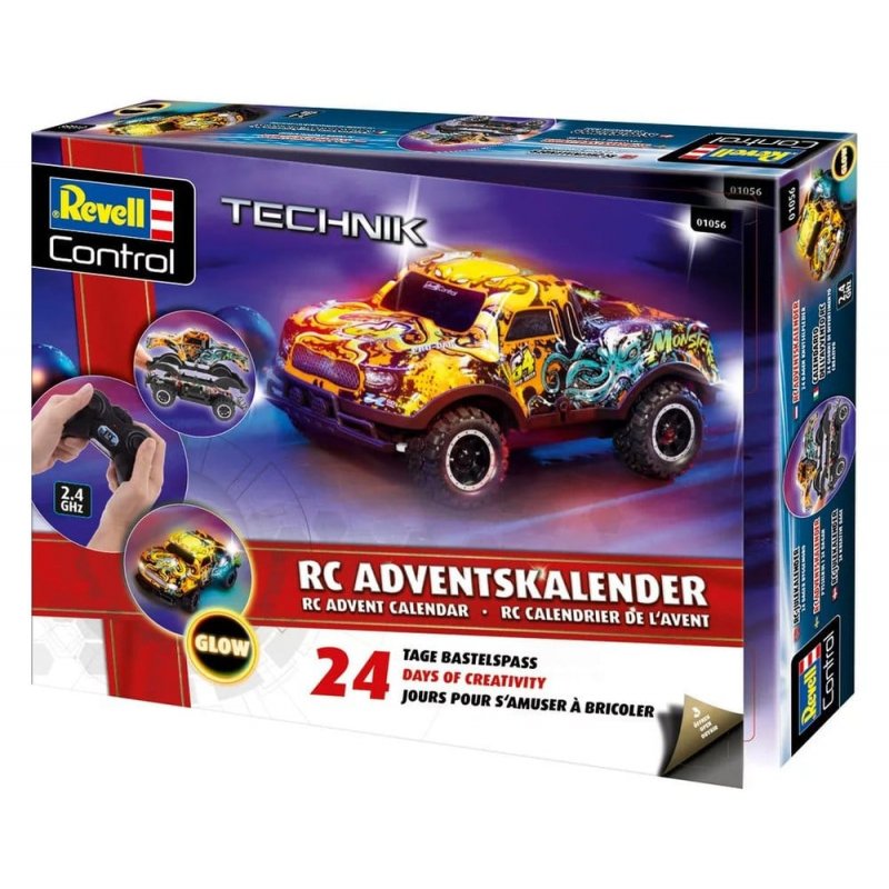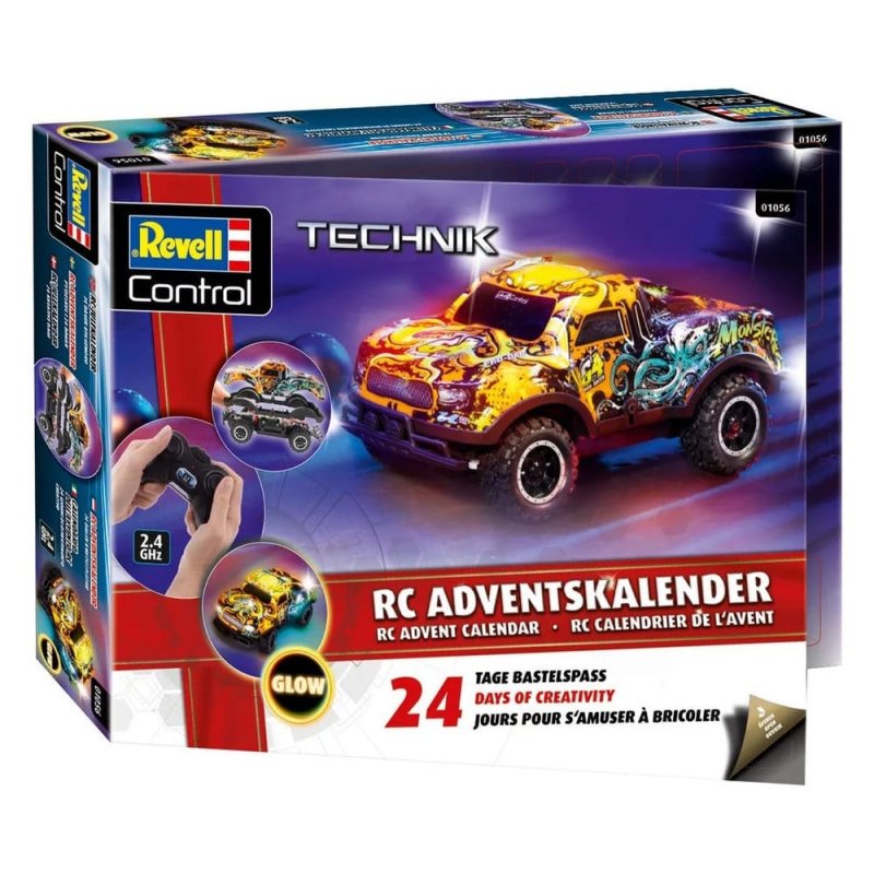 Advent calendar from Revell: 24 days of fun playing and assembling the RC Car Christmas Driver. Experience the pre-Christmas season with the Revell Advent Calendar and the exciting RC Christmas Driver. A new part every day until the luminous, robust vehicle is ready on December 24th. Illuminated body for exciting rides. Long driving time for long-lasting fun. Robust chassis and off-road tires for every adventure, indoors and outdoors. Perfect for children aged 6 and over. Make the Advent season unforgettable.Scope of delivery: 1x kit, 1x 2CH-GHz remote control, 1x screwdriver, 1x operating instructions, 2 pylons, batteries.Product Details:- Radio system: GHz - Recommended age (according to packaging): 6+ - Equipped with LED: Yes - Indoor/Outdoor: Indoor & Outdoor - Length (mm): 275 - Maximum speed RC (km/h): 7 - Range (m): 20 - Operating time (min.): 25 min. - Power supply model type IEC: LR6 - Weight (g): 510