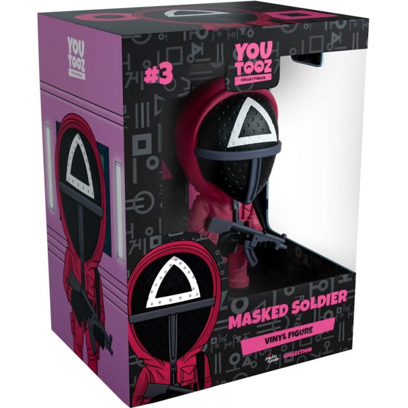 "I would like to extend a heartfelt welcome to you all."The Masked Soldier Makes their Youtooz debit with absolutely no sinister intentions... Standing at 4.5 inches tall, he holds a grey submachine gun at the ready in his gloved black hands as he wears a pink jumpsuit covered in utility pockets. The hood is raised over his head leaving only his black mesh mask revealed, its front has a 'T' plating at the bottom while the top is printed with a large white triangle. The exterior of his packaging sees him standing in front of a group of pink jumpsuits soldiers standing in formation on top of a set of stairs. The interior is a deep black and is laden with grey symbols which spill onto the protective packaging that has a pink bow running across it, all while his figure can be seen through the large clear window at its front. This collectible ships in a matte, embossed, protective outer sleeve and a custom sized plastic protector for maximum protection during shipping.About Squid Game:Squid Game is a Korean Netflix TV show in which 456 players in serious financial hardship must face off in a series of deadly children's games in the hopes of winning a life changing sum of money. Only who organized this, and at what cost? Certainly not the lives of the contestants...
