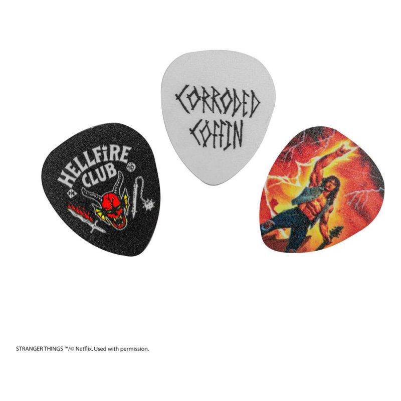 Show your love for Hawkins' favorite metalhead with our exclusive Eddie Munson guitar pick necklace! This unique accessory comes with three interchangeable guitar picks that fit perfectly inside the holder, letting you switch up your style whenever you want.Choose between the iconic Hellfire Club logo, Eddie's legendary trailer rooftop performance, or the "Corroded Coffin" design. Whether you're a Stranger Things superfan, musician, or just someone who wants to keep Eddie's memory alive, this necklace is the most metal way to show your dedication to the hero of Hawkins.- Composition: Zinc Alloy, Stainless Steel and Plastic - Chain length: 60cm - Locket size: 3 x 4cm - 3x Guitar Pick: 2.5 x 3cm