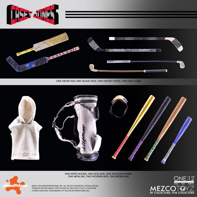 Goongala never looked so tough. Casey Jones returns to the One:12 Collective lineup, this time, battle-hardened and ready to rumble.Inspired by his rough-and-tumble street style, the One:12 Collective Casey Jones is outfitted in a sleeveless red knit top, sweatpants, and sneakers. His look channels raw urban justice.A fierce ally to the Turtles, a native New Yorker and a nightmare to lowlifes; Casey comes equipped with a full arsenal of improvised weaponry: bats, hockey sticks, and clubs galore. His trusty golf bag holds the tools of his trade, while his interchangeable masked portraits capture every side of this anti-hero's fury.THE ONE:12 COLLECTIVE CASEY JONES FIGURE FEATURES:- One:12 Collective body with over 32 points of articulation - Hand-painted authentic detailing - Approximately 17cm tall - 3 interchangeable head portraits - 10 interchangeable hands: - 1 pair of fists (L&R) - 1 pair of posing hands (L&R) - 1 pair of gripping hands (L&R) - 1 pair of relaxed hands (L&R) - 1 pointing hand (L) - 1 grabbing hand (R)COSTUME:- Sleeveless red knit top - Sweatpants - Sneakers - Shoulder guard - Golf bag - White hoodieACCESSORIES:- 1 cricket bat - 1 goalie stick - 2 hockey sticks - 2 golf clubs - 1 metal bat - 2 wooden bats (one broken) - 1 One:12 Collective display base with logo - 1 One:12 Collective adjustable display postThe One:12 Collective Casey Jones is packaged in a collector-friendly box, designed with collectors in mind.