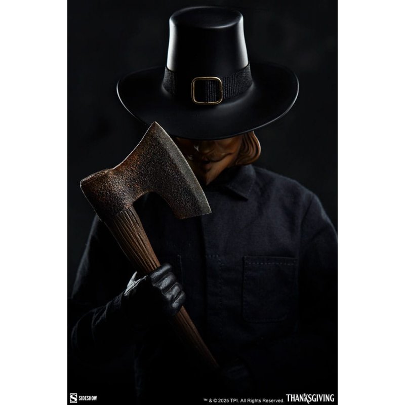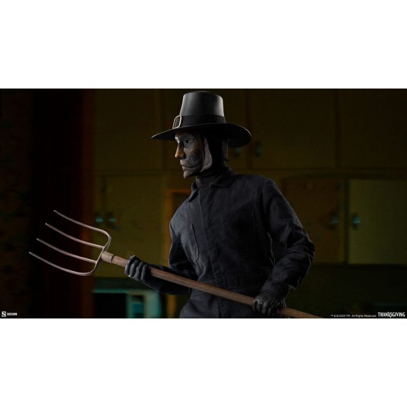"No one appreciates subtlety anymore. To go viral, you really need to hit people over the head."We hope you brought your appetite - Sideshow presents the John Carver Sixth Scale Figure. This killer horror collectible pays tribute to the main dish of the holiday horror film Thanksgiving (2023).You don't need to wait until Black Friday to start slashing when John Carver steps in to deliver a lesson in being thankful - for your life! This horror movie figure is fully articulated and comes stuffed with more accessories than a trussed-up turkey so you can really play with your food.Dressed in a black jumpsuit and undershirt, the mysterious masked killer comes with two John Carver faces that magnetize to the figure: one traditional mask and one melted from slaving over a hot stove to prepare his Thanksgiving feast. He also wears a magnetized pilgrim hat and sculpted boots to complete his simple yet sinister look. Add his optional turkey apron and microphone headset for extra festive flair from the film's climax.Of course, what would holiday dinner be without all the fixings? The John Carver Sixth Scale Figure features a collection of killer kitchen tools for preparing a buffet of carnage. Pick between a pitchfork, an axe, a meat tenderizer, a carving knife, and a tranquilizer gun for doling out servings of danger at the dinner table. Then, don't forget to raise a toast to all the sacrifice that went into preparing your meal with a goblet full of victim Amy's blood and a fork loaded up with Kathleen's cooked flesh. Not so hungry? But the skin is the best part!The John Carver Sixth Scale Figure also includes a total of seven sculpted, gloved hands for interacting with his numerous accessories: a pair of open hands, a pair of grip hands for the weapons, a right gesture hand, a right trigger hand for the tranquilizer, and a right hand for holding the goblet.No leftovers. Serve yourself up a slice of slasher horror with the John Carver Sixth Scale Figure by Sideshow today.