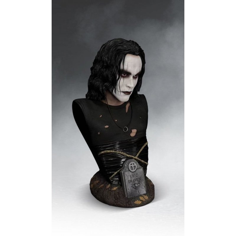 Standing 28" tall, this lifesize bust is a commanding tribute to Brandon Lee's unforgettable portrayal of Eric Draven in The Crow, capturing the character in a moment of cold resolve. Every contour of his face has been carefully sculpted to reflect the stark, poetic intensity and restrained fury that defined his performance. The iconic face paint is layered with subtle texture, preserving the raw, hand applied look that made the character feel human.Premium acrylic eyes bring the portrait to life with striking realism. They catch and hold just enough reflection that, as you move around the piece, the gaze seems to follow, creating an unsettling sense of presence that painted eyes simply cannot replicate.Each piece is individually hand-finished and hand-painted to achieve nuanced skin tones, while realistic rope texture and contrasting surface finishes add depth and definition to his iconic costume.The themed base anchors the piece in Eric Draven's mythology. A weathered grave marker bearing his name rises from textured earth scattered with fallen leaves, grounding the bust in atmosphere without overpowering the portrait itself.A striking homage to a performance that transformed a character into a legend!Limited to 500 pieces.
