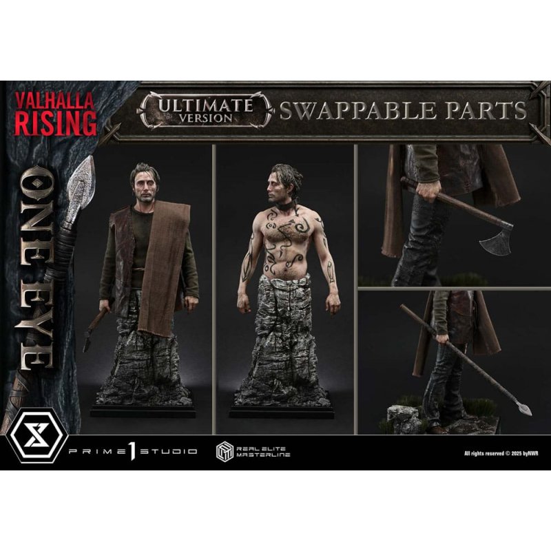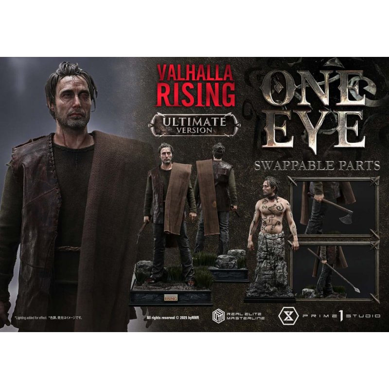 Violence clings to him. A single eye sees the end.The Silent Warrior, captured in 1/4 scale realism.Spanning six chapters, "Valhalla Rising" is a mythic tale that explores the essence of humanity. From this visionary film by director Nicolas Winding Refn comes "One Eye," brought to life in the Real Elite Masterline series.The Silent Warrior who escapes captivity and walks a long, unending road. This statue was crafted at Refn's personal request, capturing the character in faithful detail. The chosen motif is his unforgettable presence as a slave warrior. Drawing upon the imagery of Chapter One, "Wrath," we designed a pose and silhouette that emanate quiet brutality.The skin and tattoos are rendered in restrained tones. The body balances muscle and flesh, refined through meticulous adjustment. Each element has been sculpted and painted with realism that reflects the full extent of the Real Elite Masterline's technological prowess. And what stands out most is the expression-one that conceals all emotion. The finely sculpted single eye and Mikkelsen's bone structure suggest even the vision that lies beyond.This Ultimate Bonus Version includes an alternate upper torso with layered clothing. The fabric costume is richly textured, and two weapon options-an axe and a spear-can be held in the right hand. Combined with the bust stand, it allows you to recreate different moments from his journey.Two exclusive bonus items are also included with this version. One is the severed head of the chieftain he defeated. The other is a certificate of authenticity bearing Refn's signature. A collector's piece that deepens the joy of customization-and the quiet thrill of owning art."I could suddenly see Mads Mikkelsen in a tiny man."The presence, so real that even the director himself was moved-now ready for your collection.Specifications:- Highly Detailed Likeness Sculpture of Mads Mikkelsen - Valhalla Rising-themed Base - 2 x Swappable Upper Bodies (A: Bare, B: Clothed) - 2 x Swappable Right Hands for Upper Body B (Axe, Spear) - 1 x Swappable Left Hand for Upper Body B (Open Hand) - 1 x Bust Stand - 1 x Stake - 1 x Rock - 1 x Swappable Left Hand for Upper Body B (Severed Head of the Chieftain) [BONUS PART] ·Certificate of Authenticity [BONUS PART]