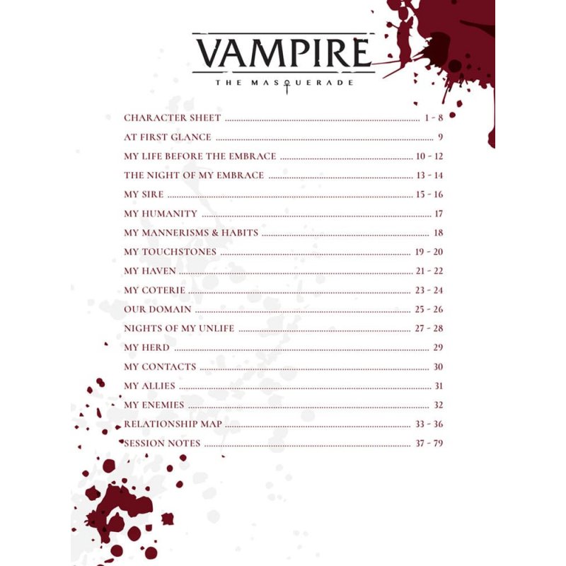 The Vampire: The Masquerade 5th Edition Roleplaying Game Roleplaying Game Character Journal is an excellent resource that help players fully customize and develop their individual characters. The journal features not only expanded characters sheets, but much, much more. The majority of the journal is rich with prompts and writing hooks to assist in creating your version of the perfect character!- Expanded character sheets - Character-building prompts and history pages - Linen-look hardcover book with 80 pages