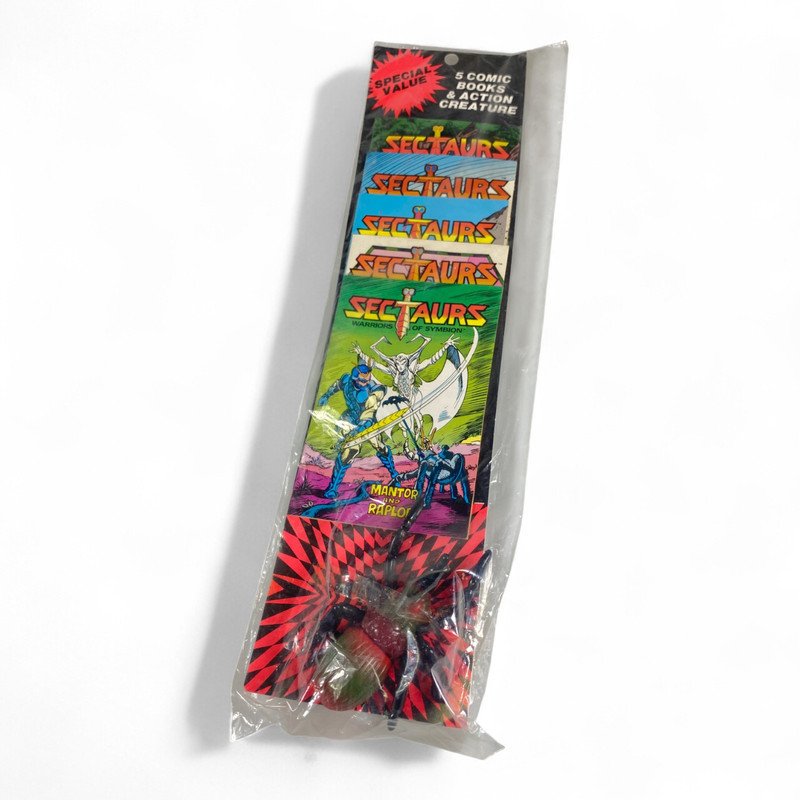 A rare 1980s value pack featuring Toxcid, the creepy companion creature from the Sectaurs toy line! Assembled and sold by Dixie Arena Liquidators, this Canadian retailer was known for bundling leftover toy and comic stock into custom-packaged deals.This sealed set includes 5 original Sectaurs mini-comics and a loose Wingid creature, all in a clear polybag with a classic Dixie Arena “Special Value” header card. A quirky and collectible example of 1980s liquidation culture — and a must-have for Sectaur fans.