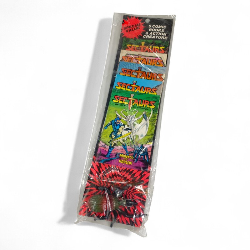 A rare 1980s value pack featuring Toxcid, the creepy companion creature from the Sectaurs toy line! Assembled and sold by Dixie Arena Liquidators, this Canadian retailer was known for bundling leftover toy and comic stock into custom-packaged deals.This sealed set includes 5 original Sectaurs mini-comics and a loose Wingid creature, all in a clear polybag with a classic Dixie Arena “Special Value” header card. A quirky and collectible example of 1980s liquidation culture — and a must-have for Sectaur fans.