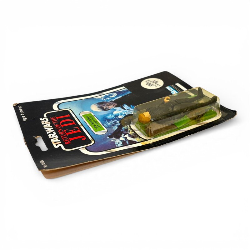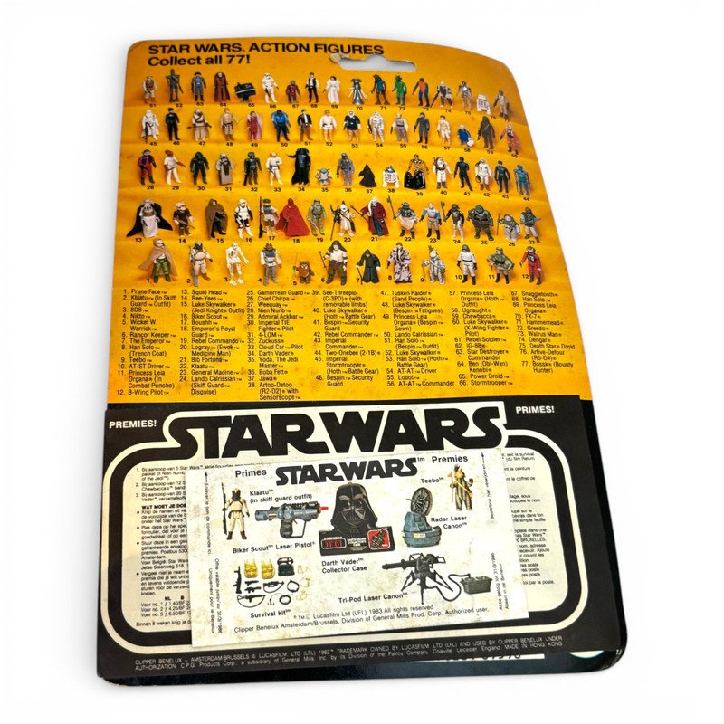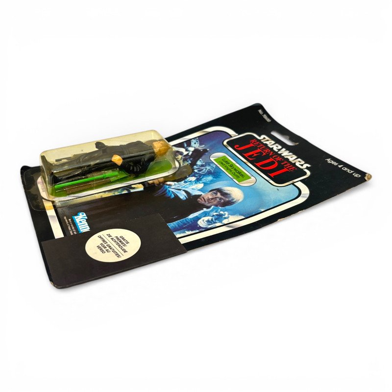 Luke Skywalker in Jedi Knight Outfit (Green Lightsaber). Kenner 77A-Back card. Features Clipper Benelux wrap-around sticker.