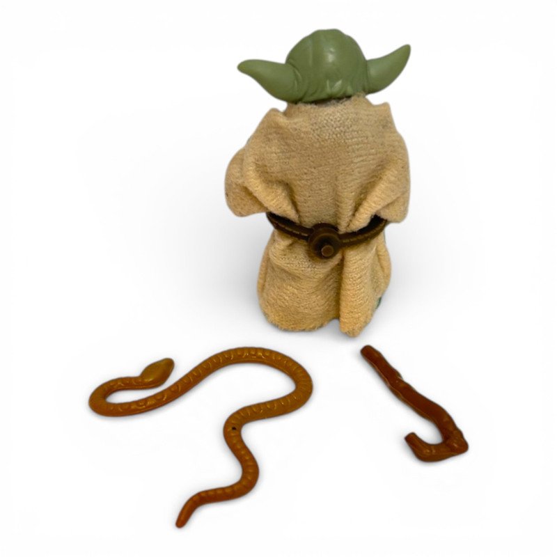 Vintage loose figure with "Pac-Man" eye variant. Includes original tan fabric robe with belt, brown snake accessory, and Gimer stick (cane). Complete and original.