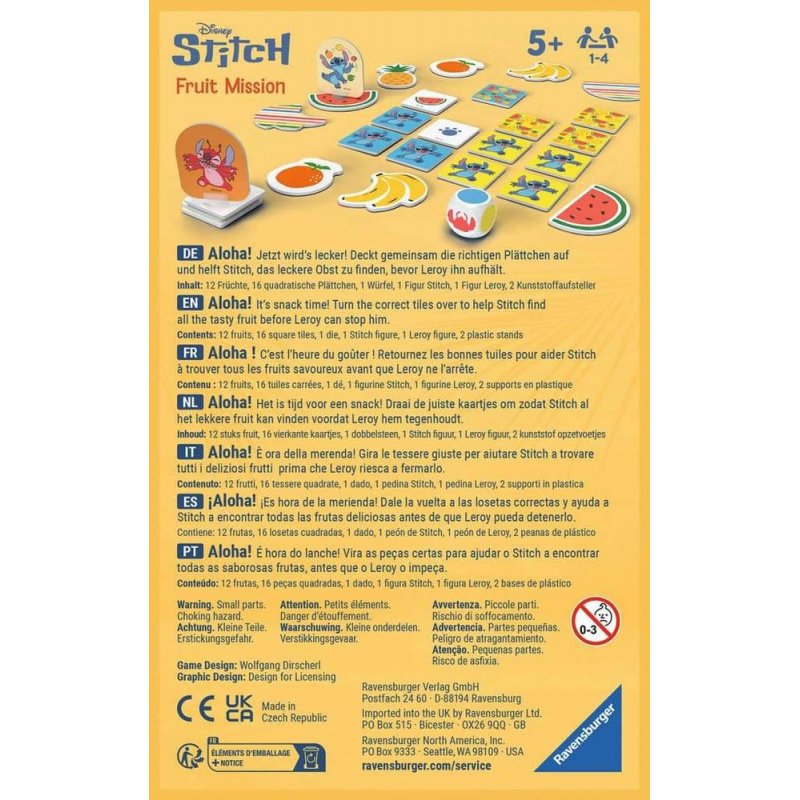 Ready for another adventure with Stitch? With this cooperative memory game, the popular blue alien comes straight to the game table! Together, everyone remembers which motifs are hidden under the square cards laid out. This is how you can specifically uncover them and help Stitch reach his goal quickly. And before Leroy gets there first. Cheeky, wild and full of energy. Stitch is not just a chaotic alien but a real star in the Disney universe. And has been for over 20 years! With his great courage, his curiosity and his big eyes, the alien with the big heart has become one of the most popular Disney characters worldwide. In this cooperative memo adventure, team spirit is required! On the table are 12 round fruit cards in a circle. In it, a total of 16 square cards in two colors. Under some are the sought-after fruits, under the others the number of spaces Stitch is allowed to move. Everyone remembers well where everything is, because only then can Stitch quickly get to his favorite fruit. But beware: Leroy is fast. A varied memory game for the whole family and an ideal souvenir for any occasion for children aged 5 and over.- Age: 5+ Years - Players: 2-4 - Playing time: 10-15 min.