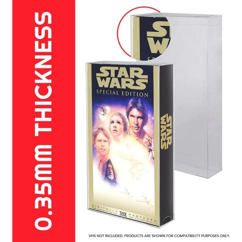 Preserve your VHS tapes with EVORETRO's 0.4mm thick clear plastic cases. This set of 25 protectors shields your valuable collection from dust and spills while offering a clear view of the contents. Perfect for collectors who cherish their classic movie tapes.