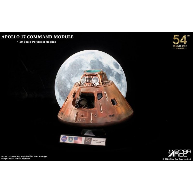 Mark the 54th anniversary of the last Moon landing with Star Ace's masterfully detailed Apollo 17 Command Module replica. Explore the pinnacle of human achievement with this meticulously designed polyresin replica crafted at 1/20 scale. Measuring 20cm in diameter, this intricately crafted model features a fully detailed interior and exterior, capturing the essence of the historic mission commanded by Gene Cernan and representing the last time humanity visited the moon. Mounted on a clear base with the full moon behind it, the module appears to be orbiting the moon one last time. The base also features a display plaque bearing the official NASA and Apollo 17 mission insignia. This is a definitive piece for serious collectors and space history aficionados and a stunning tribute to the Apollo 17 mission.