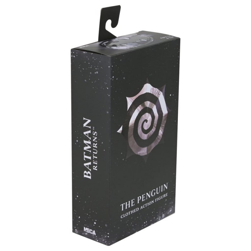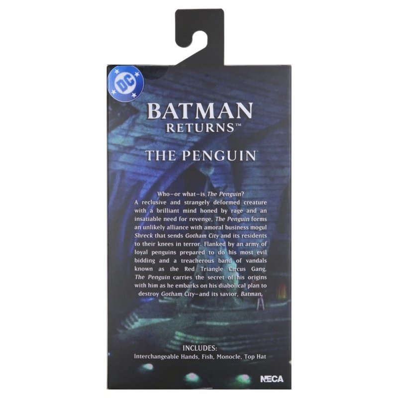 NECA presents this clothed action figure of The Penguin from Tim Burton's 1992 masterpiece Batman Returns, featuring Danny DeVito in an unforgettable performance as the iconic villain.Abandoned as a child by his parents, he is now a reclusive and deformed man, with a twisted mind honed by rage and an insatiable need for revenge, hiding in the tunnels and sewers underneath Gotham City. The Penguin found a home and base of operations at the Arctic World Pavilion in the abandoned Old Gotham City Zoo.The Penguin and the Red Triangle Circus gang form an unlikely alliance with amoral business mogul Max Shreck that sends Gotham City and its residents into a frenzy of terror. Paying homage to vintage toy lines, The Penguin figure is fully articulated and wears tailored soft goods clothing, including a poseable coat with wire.Accessories include top hat, monocle, fish snack, interchangeable gloved hands, and more. This 8-inch scale figure comes in window box packaging with slipcover.