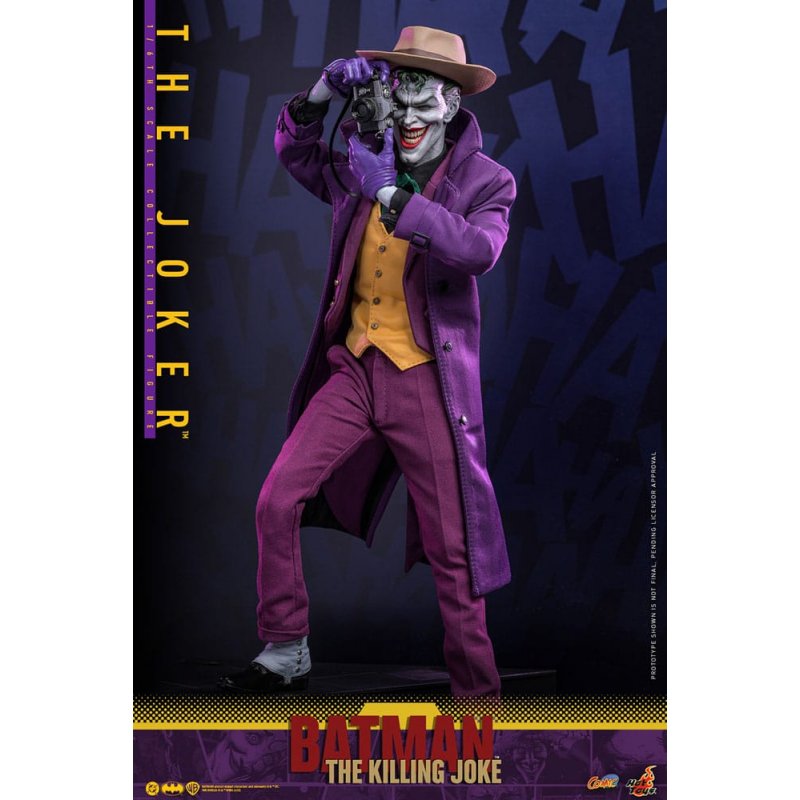 "All it takes is just one bad day to reduce the sanest man alive to lunacy. That's how far the world is from where I am. Just one bad day." - The JokerAlan Moore and Brian Bolland's Batman: The Killing Joke stands as one of the most iconic and unsettling graphic novels in Batman history. With its exploration of the Joker's origin and twisted philosophy, the story asks a chilling question: Can a single bad day push someone into madness? The Joker stages a horrific carnival as a stage for his dark experiment, kidnapping Commissioner Gordon and brutally testing his sanity. These themes of psychological horror and moral ambiguity have cemented The Killing Joke as the definitive Joker tale.Sideshow and Hot Toys is proud to present the The Joker Sixth Scale Collectible Figure, inspired by the comic Batman: The Killing Joke. The action figure includes two newly developed head sculpts equipped with rolling eyeballs, detailed wrinkles, make-up, and meticulously sculpted curly green hair that completes the haunting visage. One head sculpt features an open-mouth grinning expression, with a magnetically attachable tongue; the other has a winking and grinning expression, with a removable hat that is interchangeable with both head sculpts. The Joker is dressed in his comic-accurate attire, coming with a wire-embedded purple coat and jacket over a yellow waistcoat, black shirt, green ribbon, black belt, and purple pants paired with black shoes. Coming with eight interchangeable gloved hands, collectors are able to pose him with his iconic expressive poses. True to the original panels, his weapons come with a small knife and a pistol that shoots a "Click Click Click" flag. Also included are a camera, a cane, and a Joker card. Completing the setup is a backdrop featuring the comic cover art of Batman: The Killing Joke, which is mountable to the specially designed figure stand.With dual head sculpts, authentic costume detail, and faithful accessories, this figure captures Joker's twisted elegance. Don't miss this masterpiece for fans and collectors who seek Gotham's darkest laugh.
