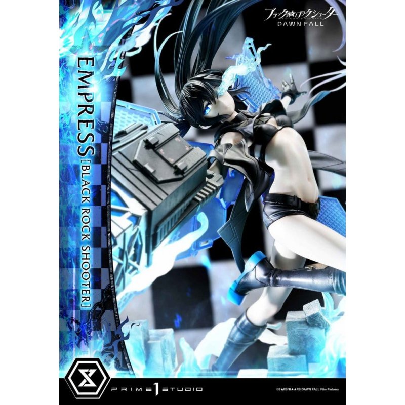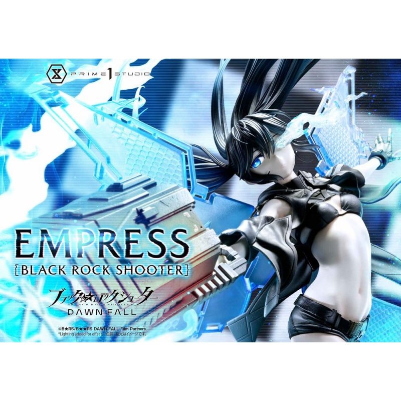 "Overdrive Key, ignition." A star racing through the darkness, shining in 1/4 scale.Set against an endless war between machines and humanity, ""BLACK ROCK SHOOTER DAWN FALL"" tells the story of girls caught in a ruined world. From the TV anime that marked the series' 15th anniversary, Empress [BLACK ROCK SHOOTER] is brought to life in the Ultimate Premium Masterline.Using the Overdrive Key to release the limiter on her combat capabilities, Empress stands as humanity's guardian when the ultimate trump card is played. This 1/4 scale statue captures her presence in high detail. Layered azure flames and twin tails are shaped as a frame, with her dancing figure set at its center. The massive muzzle thrust forward enhances the sense of depth and brings the scene to life with striking realism.Cool-toned skin finished in matte texture. Translucent wings manifested across her back. A Coil Gun that embodies functional beauty. Every element of Empress has been carefully translated into three dimensions with attention to design and material expression. Even the stacked cubes of the base carry a weight that evokes the advance of the mechanical army. LED illumination is also built into her eyes, the Coil Gun, and the azure flame effects, deepening the immersive atmosphere with radiant light.A star racing through the darkness, descended in 1/4 scale. Bearing the name BLACK ROCK SHOOTER, this is a centerpiece worthy of any collection."Product Specifications: - BLACK ROCK SHOOTER DAWN FALL-Themed Base - LED Illumination (Eyes, Coil Gun, Effect)LED Power Supply Method: TBD * Please prepare batteries, USB cables, or other necessary items depending on the final power supply method."