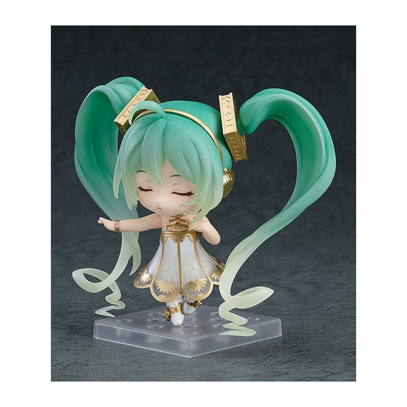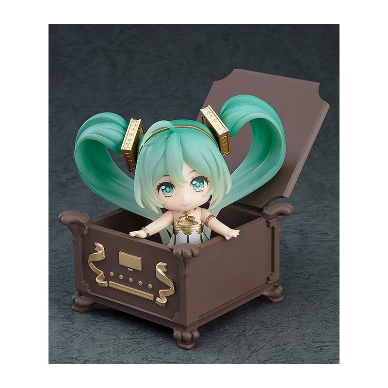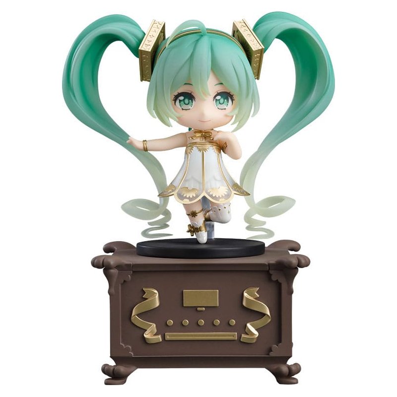 From "Character Vocal Series 01: Hatsune Miku" comes a Nendoroid of Hatsune Miku based off of the main visual from the full orchestra concert "Hatsune Miku Symphony 2020 ~5th Anniversary~". The Nendoroid faithfully captures the beautiful design originally illustrated by Rella. She comes with two face plates including a smiling expression and an expression with closed eyes.Her gramophone-inspired dress has been recreated in detail with translucent parts and gold paintwork. The Nendoroid also comes included with a box-style stand that can also be used as a storage box. Additionally, a joined hands part that can be used with Nendoroid Hatsune Miku: Symphony 2018-2019 Ver. (sold separately) to display them holding hands is included as well. Be sure to add her to your collection!