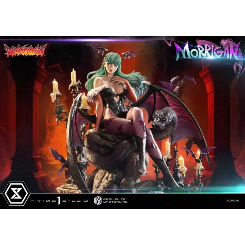 Eyes that seek pleasure. Wings that glow in the dark.The untamed succubus, brought to life in demonic realism.From the iconic fighting game series "Darkstalkers," where creatures of the night clash in the shadows, Morrigan joins the Real Elite Masterline from this uniquely ambitious entry in Capcom's fighting history.This statue is a reimagining of her distinctive anime-style appearance, crafted with an imaginative touch. Prime 1 Studio set out to capture what we call "demonic realism" a careful fusion of realism and stylization that brings forth her otherworldly, seductive curves. Her leg-crossing pose radiates both the elegance of the noble Aensland bloodline and the unrestrained nature of one who cannot be bound, not even by the throne of the underworld.Her eyes, highlighted by their jade-like luster, have been slightly enlarged to enhance their impact. The narrow, vertical pupils reminiscent of nocturnal predators subtly reflect her demonic heritage. The wing membranes shimmer with pearl paint that captures an eerie glow, while her porcelain-like skin tone suggests a beauty that defies human understanding. Carefully applied textures bring out the distinct feel of leather and arm sleeves. Every detail reflects the pinnacle of modern sculpting and painting technology.The custom gothic base features a coiled serpent rearing its head and petrified beings reduced to a throne imagery that evokes Morrigan's power and allure. Even in stone, blood continues to flow, a symbol of endless pleasure and pain.Morrigan, now reborn with new allure. Display her alongside the upcoming Lilith release to enjoy them as a pair. This darkly enchanting succubus, brought to life with demonic realism, deserves the center stage of your Darkstalkers collection.Specifications:- Darkstalkers Themed Base