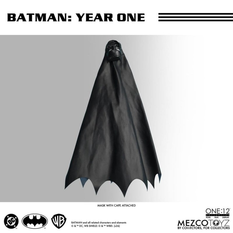Straight from the pages of Batman: Year One, comes the Dark Knight at the very beginning of his war on crime. With unstoppable determination, Batman forges his path while refining his use of intimidation, technology and grit to create the mythic legend he is destined to become.Outfitted in a comic-accurate, tailored cloth suit with a wired cape, allowing Batman to strike dramatic, grounded poses straight from the iconic storyline. Multiple interchangeable head portraits showcase a range of intense expressions, including an unmasked Bruce Wayne, reflecting the physical and emotional toll of his first year as Gotham's vigilante.Equipped with an experimental arsenal, Batman comes prepared with batarangs, explosives, a blowgun with dart effect, a recording device, a floodlight, and additional accessories recreating key moments from Year One.In Batman: Year One, Bruce Wayne returns to Gotham to wage a personal war on crime, crossing paths with a corrupt system, ruthless criminals, and a city in desperate need of a symbol.THE ONE:12 COLLECTIVE BATMAN FIGURE FEATURES:- One:12 Collective body with over 30 points of articulation - 5 head portraits - Hand-painted authentic detailing - Approximately 17 cm tall - 13 interchangeable hands: One (1) pair of fists (L & R) One (1) pair of grabbing hands (L & R) One (1) pair of cape-holding hands (L & R) One (1) pair of grenade-holding hands One (1) pair of tape recorder hands (L) One (1) pair of blowgun-holding hands (R) Two (2) pairs of batarang-throwing hands (L & R)COSTUME:- Comic-accurate Batman suit with cloth elements - Utility belt - Cape with integrated posing wire - Custom gloves and boots - Loose mask with attached cape accessoryACCESSORIES:- 1 floodlight - 1 tranq gun - 1 tape recorder - 1 blowgun with dart FX - 3 grenades (three styles) - 3 batarangs - Small batarang throwing FX (attaches to hands) - Belt explosion FX - 1 One:12 Collective display base with logo - 1 One:12 Collective clear adjustable display postEach One:12 Collective Batman: Year One figure is packaged in a collector-friendly box, designed with collectors in mind.This fully posable action figure stands approx 17 cm tall.