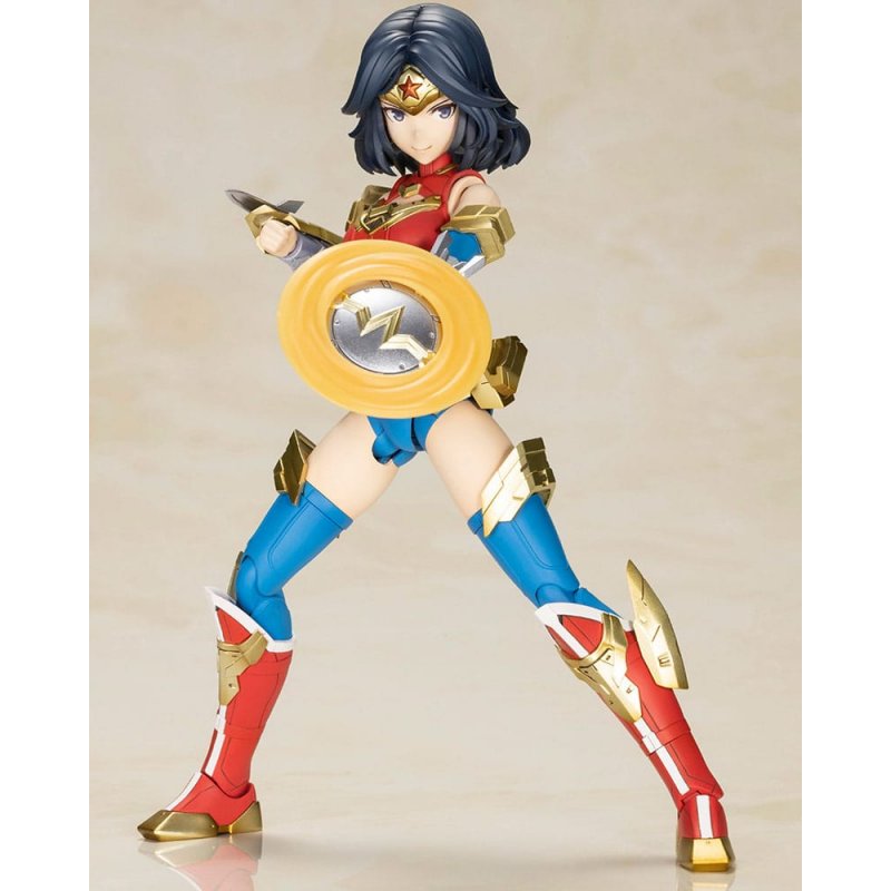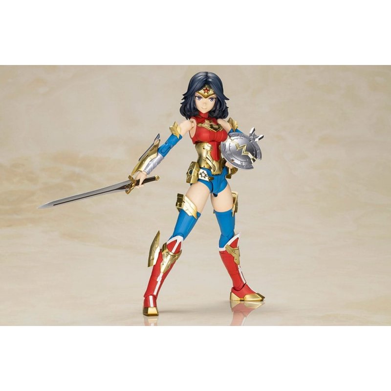 "One of The Big Three of DC characters, Wonder Woman returns as a plastic model kit based on a new original illustration by the beloved Humikane Shimada! This Another Color Ver. is a new color variation of Wonder Woman. Three face parts are included (normal front-facing, normal left-facing, and yelling). A sword, shield, the Lasso of Truth, various armor parts, shield effect parts, and a simple base are included in this kit. Each joint has a wide range of flexibility to allow for diverse posing such as crossing the arms like in the comics. *This product is a plastic model kit that requires assembly. What is "Cross Frame Girl"? Cross Frame Girl is a collaboration series that combines Kotobukiya's original content "Frame Arms Girl" and its advanced technology with other well-known media content. The kits come with multi-colored parts and face parts pre-printed with tampography, making them easy to assemble with no paint required. The kits are equipped with 3mm joints and PVC hand parts, making them compatible with the weapons and armor of a majority of M.S.G Weapon Unit series, Frame Arms Girl, and Frame Arms series. Cross Frame Girl models is also compatible with currently sold Frame Arms Girl models so users can interchange head, arm, and leg parts for further customization options.