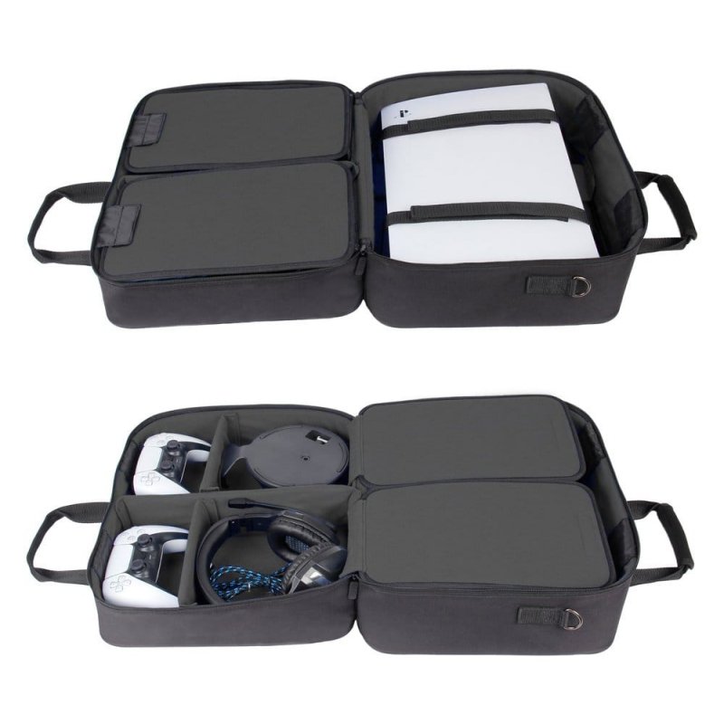 40,6 x 31,7 x 19,7 cmThe USA Gear S23 travel case offers customizable, unparalleled protection for your PlayStation console and accessories. - Padded, scratch-resistant interior with bi-fold design - Customizable compartments for headsets, cables, games, and controllers - Two security straps to hold the console in place - Durable, water-resistant RipStop nylon exterior - Heavy-duty carrying handle and removable shoulder strap - External Dimensions: 43,2 cm x 35,6 cm x 20,3 cm - Interior Dimensions: 40,6 x 31,7 x 19,7 cm