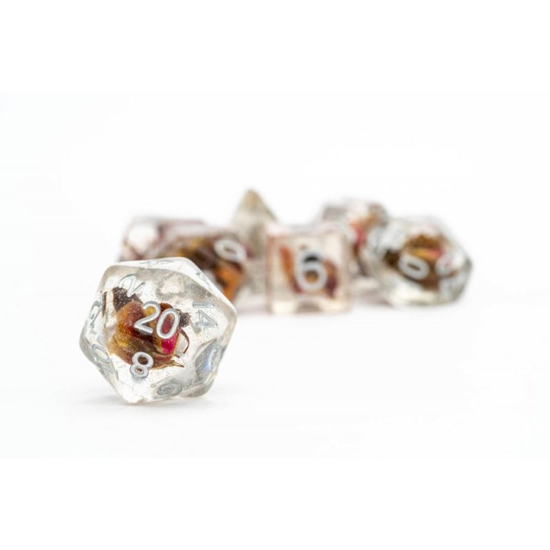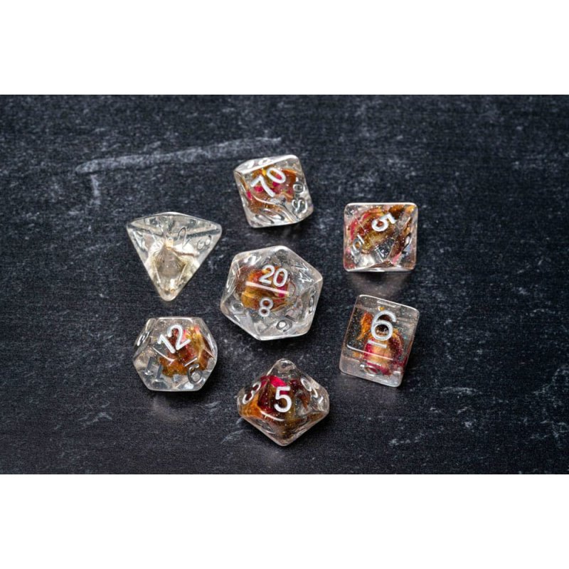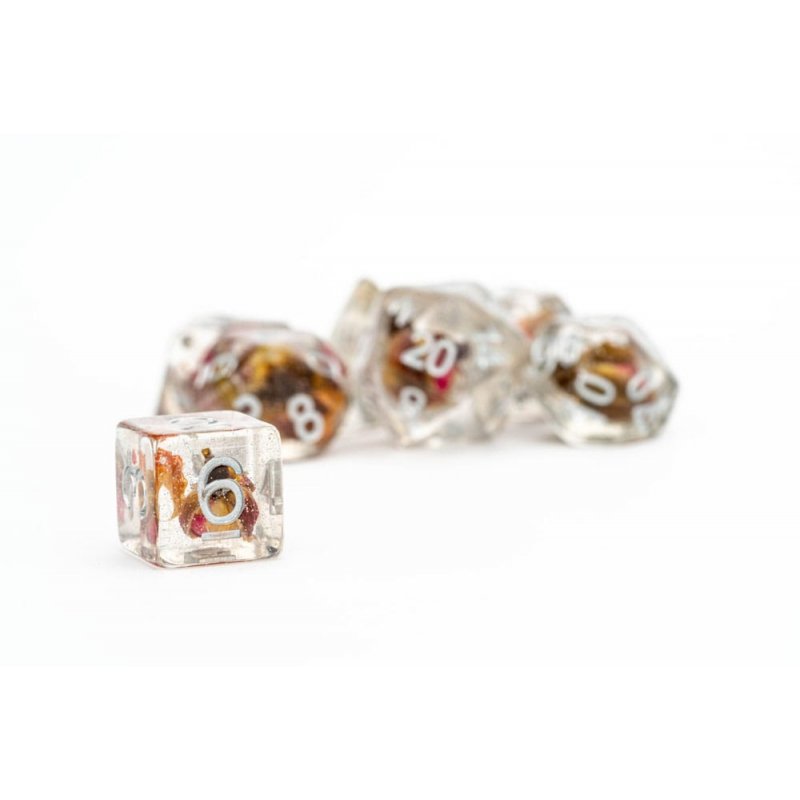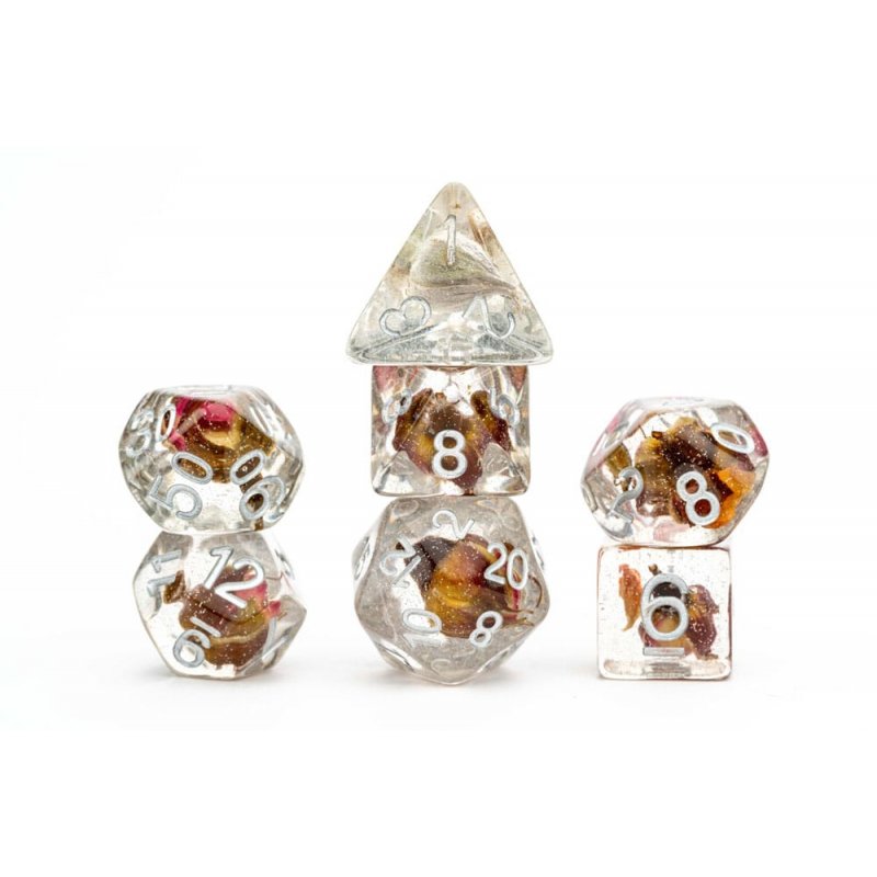 Rose dice are infused with real roses! These are full-sized 16mm polyhedral dice sets that come with 7 dice (d4, d6, d8, d10, d10%(00-90), d12, and d20).Contains: 7 dice