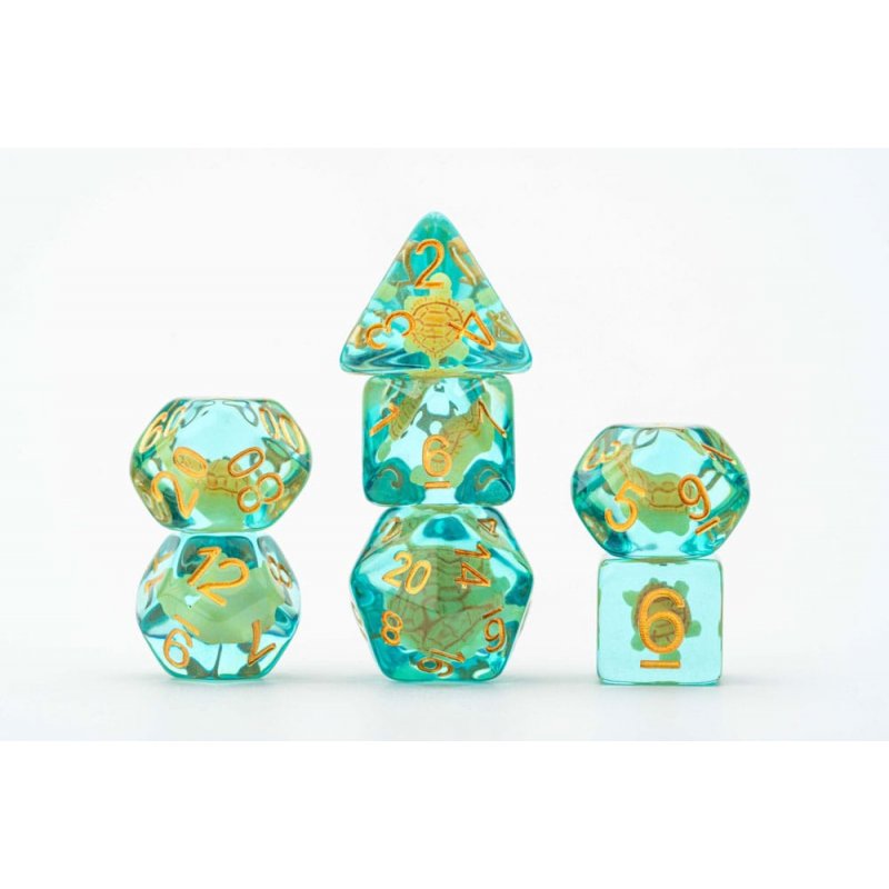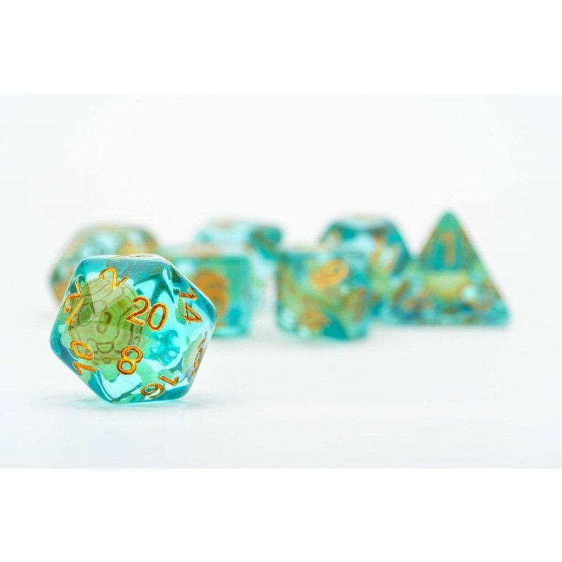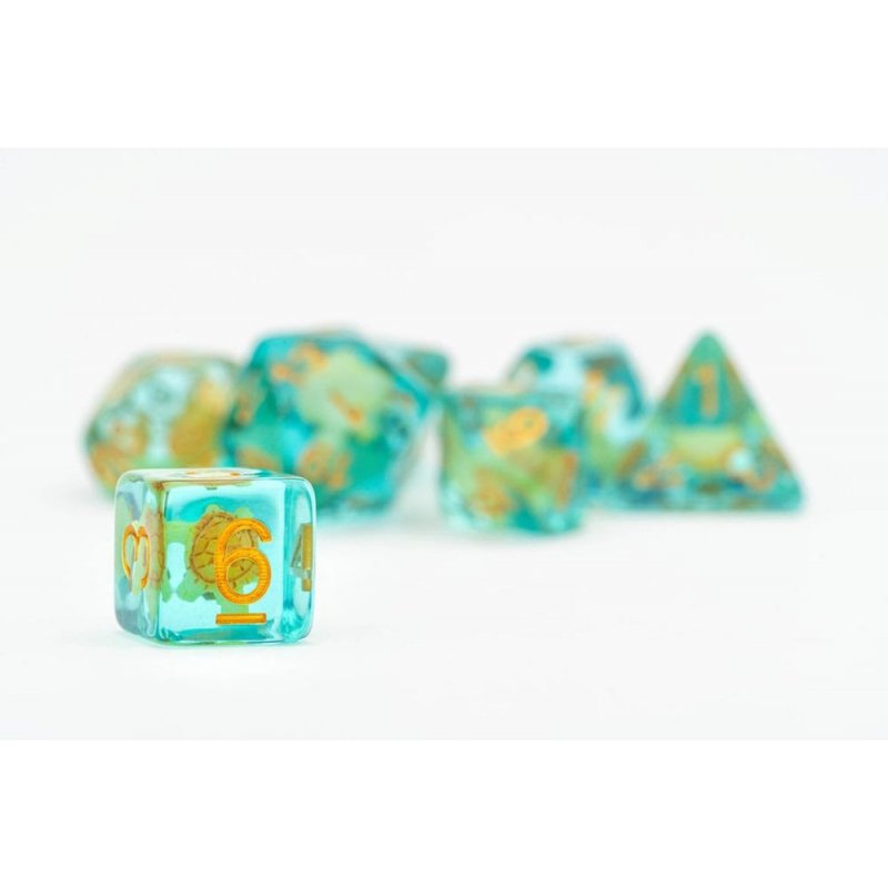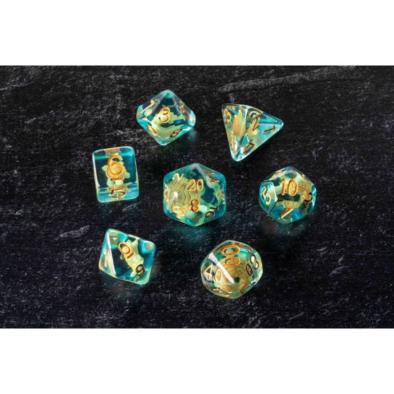 FanRoll resin dice have unique inclusions that add flare to any gaming table. These are full-sized 16mm polyhedral dice sets that come with 7 dice (d4, d6, d8, d10, d10%(00-90), d12, and d20).Contains: 7 dice